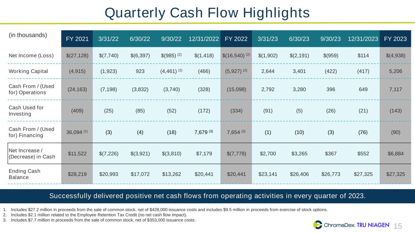 14 Quarterly Balance Sheet Highlights Reflects disciplined cash management and optimization measures throughout 2023, while continuing to invest in key areas to support both immediate and long term growth objectives. (in thousands) 12/31/21 3/31/22 6/30/22 9/30/22 12/31/22 3/31/23 6/30/23 9/30/23 12/31/23 Key Drivers (December 31 2023 vs 2022) Cash $28,219 $20,993 $17,072 $13,262 $20,441 $23,141 $26,406 $26,773 $27,325 Up $6.9 million driven by cash provided from operating activities Inventory 13,601 15,307 15,753 15,636 14,677 11,908 11,973 12,624 14,525 Down $0.2 million driven by improvements in inventory management, offset by higher sales requiring greater inventory on-hand Trade Receivables 5,226 6,310 4,228 4,744 8,482 9,221 6,118 5,601 5,234 Down $3.2 million driven by mix of customer sales and timing of collections, including absence of $2.0MM Nestlé upfront purchase in 2022 Accrued Expenses 6,481 8,126 6,696 6,756 7,337 8,610 8,079 9,193 9,493 Up $2.2 million driven by changes in expenses and accrual for employee bonuses Accounts Payable 10,423 9,780 10,197 9,119 9,679 8,951 10,031 9,198 10,232 Up $0.6 million driven by changes in inventory, advertising and other expenses Equity $31,727 $25,877 $20,778 $21,023 $28,672 $28,017 $27,150 $27,308 $28,456 Down $0.2 million driven by net loss, partially offset by share-based compensation