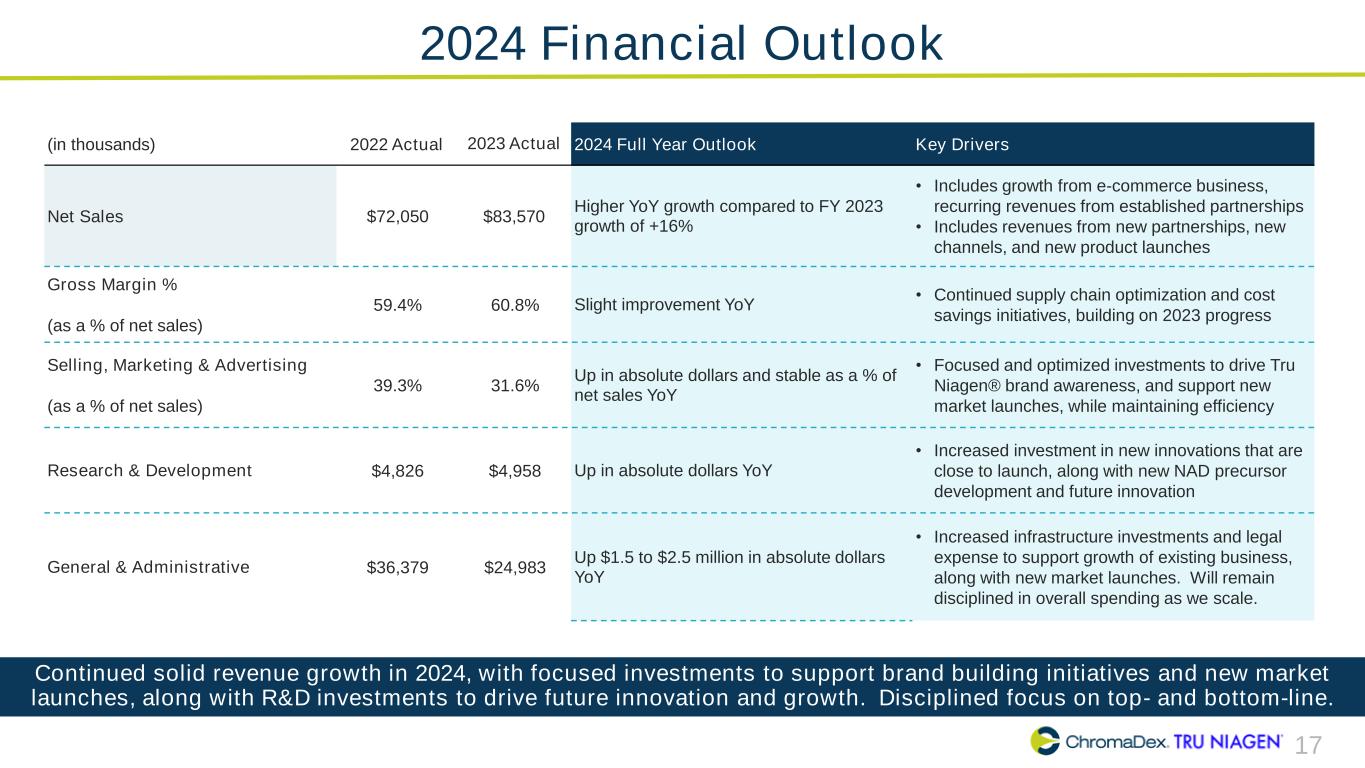 16 2023 Full Year Outlook Recap (in thousands) 2022 Actual 2023 Outlook (1) 2023 Actual Comments Achieved?(2) Net Sales $72,050 Between 14% - 16% growth $83,570 Total net sales grew by +16% ✓ Gross Margin % (as a % of net sales) 59.4% Stable YoY 60.8% Improved 140 bps ✓ Selling, Marketing & Advertising (as a % of net sales) 39.3% Down as a % of net sales 31.6% Down 770 bps as a % of net sales ✓ Research & Development $4,826 Up in absolute dollars YoY $4,958 Up $0.1 million ✓ General & Administrative $28,286 Flat to down $1 million YoY $24,983 Down $3.3 million ✓ Adjusted EBITDA $(9,973) Outlook not provided $1,900 Improvement of $11.9 million N/A Company delivered on its latest financial outlook across all metrics and exceeded targets for gross margin % and G&A expense. 1. 2023 Outlook as presented on Q3 2023 earnings call. 2. Compares 2023 actuals to 2023 Outlook.