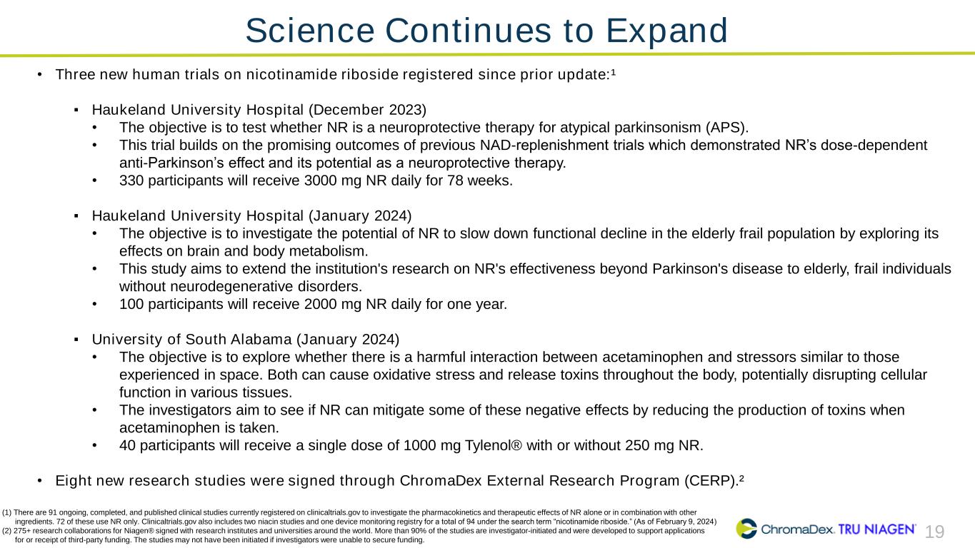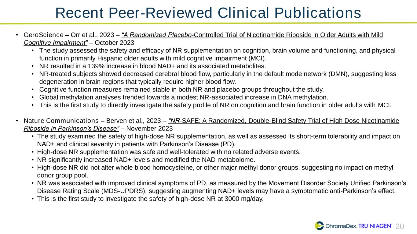 19 • Three new human trials on nicotinamide riboside registered since prior update:¹ ▪ Haukeland University Hospital (December 2023) • The objective is to test whether NR is a neuroprotective therapy for atypical parkinsonism (APS). • This trial builds on the promising outcomes of previous NAD-replenishment trials which demonstrated NR’s dose-dependent anti-Parkinson’s effect and its potential as a neuroprotective therapy. • 330 participants will receive 3000 mg NR daily for 78 weeks. ▪ Haukeland University Hospital (January 2024) • The objective is to investigate the potential of NR to slow down functional decline in the elderly frail population by exploring its effects on brain and body metabolism. • This study aims to extend the institution's research on NR's effectiveness beyond Parkinson's disease to elderly, frail individuals without neurodegenerative disorders. • 100 participants will receive 2000 mg NR daily for one year. ▪ University of South Alabama (January 2024) • The objective is to explore whether there is a harmful interaction between acetaminophen and stressors similar to those experienced in space. Both can cause oxidative stress and release toxins throughout the body, potentially disrupting cellular function in various tissues. • The investigators aim to see if NR can mitigate some of these negative effects by reducing the production of toxins when acetaminophen is taken. • 40 participants will receive a single dose of 1000 mg Tylenol® with or without 250 mg NR. • Eight new research studies were signed through ChromaDex External Research Program (CERP).² (1) There are 91 ongoing, completed, and published clinical studies currently registered on clinicaltrials.gov to investigate the pharmacokinetics and therapeutic effects of NR alone or in combination with other ingredients. 72 of these use NR only. Clinicaltrials.gov also includes two niacin studies and one device monitoring registry for a total of 94 under the search term “nicotinamide riboside.” (As of February 9, 2024) (2) 275+ research collaborations for Niagen® signed with research institutes and universities around the world. More than 90% of the studies are investigator-initiated and were developed to support applications for or receipt of third-party funding. The studies may not have been initiated if investigators were unable to secure funding. Science Continues to Expand