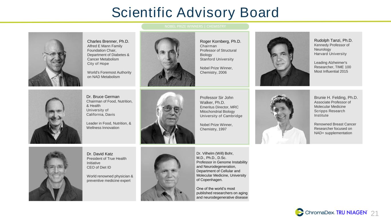 21 Scientific Advisory Board Charles Brenner, Ph.D. Alfred E Mann Family Foundation Chair, Department of Diabetes & Cancer Metabolism City of Hope World's Foremost Authority on NAD Metabolism Roger Kornberg, Ph.D. Chairman Professor of Structural Biology Stanford University Nobel Prize Winner, Chemistry, 2006 Rudolph Tanzi, Ph.D. Kennedy Professor of Neurology Harvard University Leading Alzheimer's Researcher, TIME 100 Most Influential 2015 Dr. Bruce German Chairman of Food, Nutrition, & Health University of California, Davis Leader in Food, Nutrition, & Wellness Innovation Professor Sir John Walker, Ph.D. Emeritus Director, MRC Mitochondrial Biology University of Cambridge Nobel Prize Winner, Chemistry, 1997 Brunie H. Felding, Ph.D. Associate Professor of Molecular Medicine Scripps Research Institute Renowned Breast Cancer Researcher focused on NAD+ supplementation Dr. David Katz President of True Health Initiative CEO of Diet ID World renowned physician & preventive medicine expert Dr. Vilhelm (Will) Bohr, M.D., Ph.D., D.Sc. Professor in Genome Instability and Neurodegeneration, Department of Cellular and Molecular Medicine, University of Copenhagen. One of the world’s most published researchers on aging and neurodegenerative disease NOBEL PRIZE WINNERS | CHEMISTRY