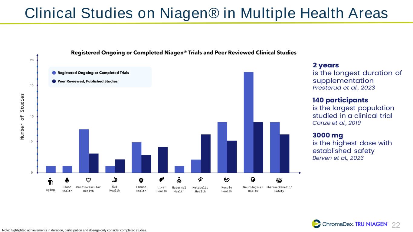 22 Clinical Studies on Niagen® in Multiple Health Areas Note: highlighted achievements in duration, participation and dosage only consider completed studies.