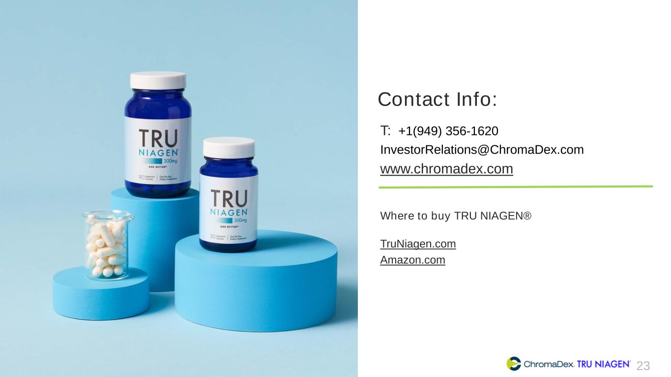 23 Contact Info: T: +1(949) 356-1620 InvestorRelations@ChromaDex.com www.chromadex.com Where to buy TRU NIAGEN® TruNiagen.com Amazon.com