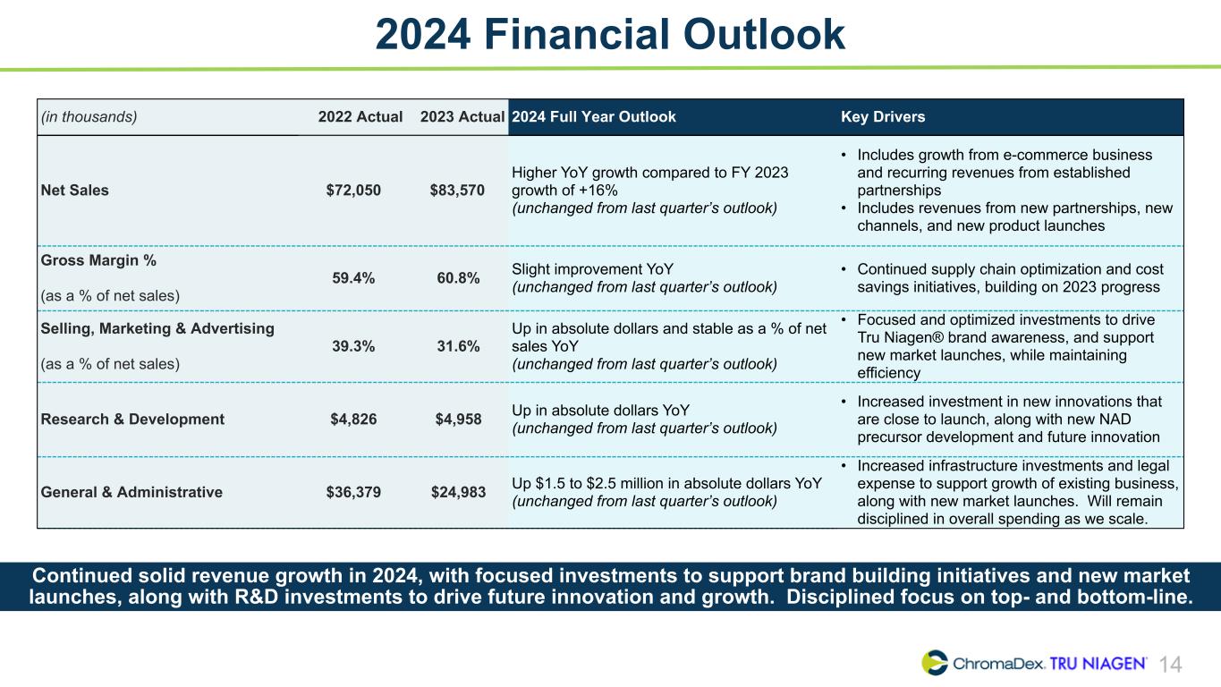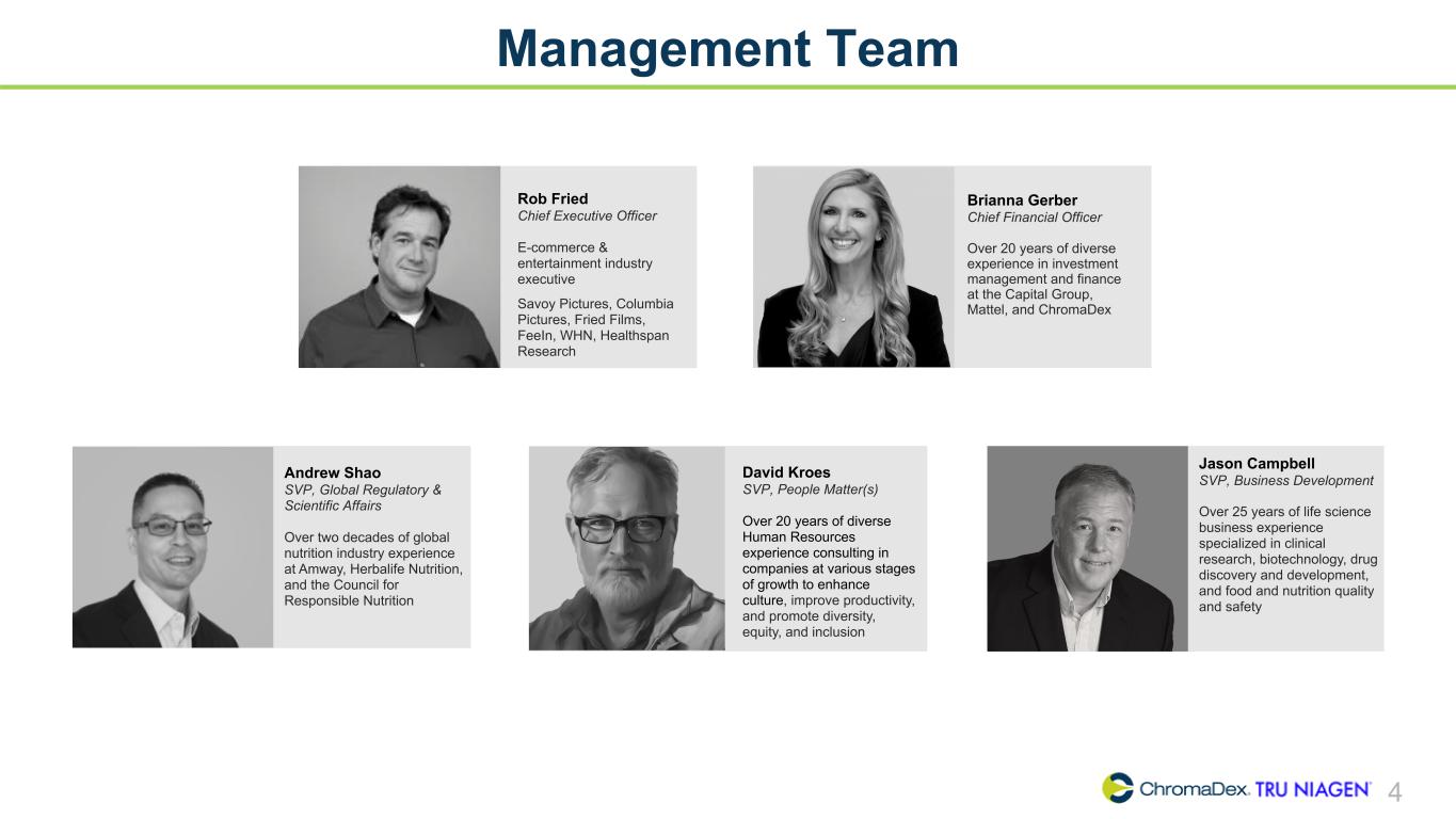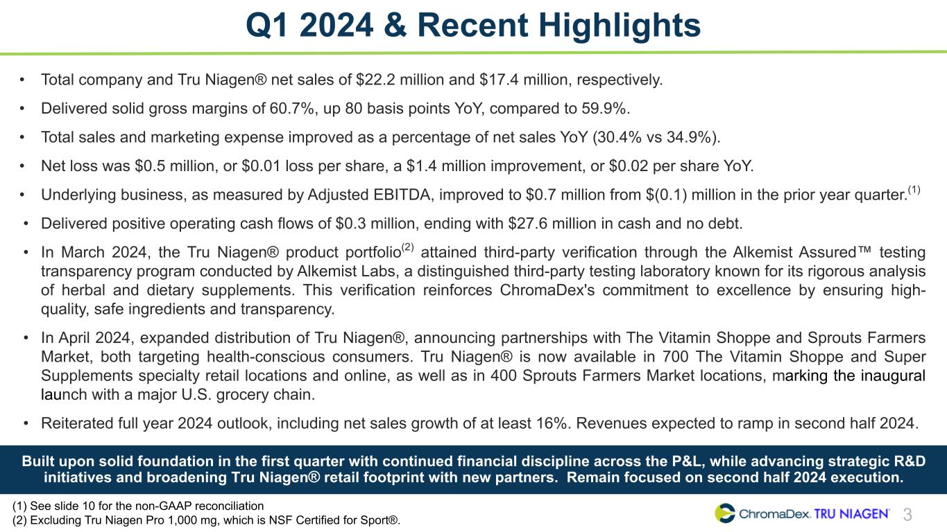 SAFE HARBOR STATEMENT SAFE HARBOR STATEMENT 2 This presentation and other written or oral statements made from time to time by representatives of ChromaDex contain “forward-looking statements” within the meaning of Section 27A of the Securities Act of 1933, as amended, and Section 21E of the Securities Exchange Act of 1934, as amended. Forward-looking statements reflect the current view about future events. Statements that are not historical in nature, such as 2024 financial outlook, and which may be identified by the use of words like “expects,” “anticipates,” “intends,” “estimates,” “plans,” “potential,” “possible,” “probable,” “believes,” “seeks,” “may,” “will,” “should,” “could,” “predicts,” “projects,” “continue,” “would” or the negative of these terms and other words of similar meaning, are forward-looking statements. Such statements include, but are not limited to, statements contained in this presentation relating to our expected sales, cash flows, planned investments, and financial performance, business, business strategy, expansion, growth, key drivers (including cost savings and increased investments), products and services we recently offered and their impact on our performance or products and services we may offer in the future and the timing of their development, sales and marketing strategy and capital outlook. Forward-looking statements are based on management’s current expectations and assumptions regarding our business, the economy and other future conditions and are subject to inherent risks, uncertainties and changes of circumstances that are difficult to predict and may cause actual results to differ materially from those contemplated or expressed. We caution you therefore against relying on any of these forward-looking statements. These risks and uncertainties include those risk factors discussed in Part I, “Item 1A. Risk Factors” of our most recent Annual Report on Form 10-K and Quarterly Report on Form 10-Q filed with the Securities Exchange Commission (the “Commission”), and in subsequent filings with the Commission. Any forward-looking statements are qualified in their entirety by reference to the factors discussed in these filings with the Commission. Should one or more of these risks or uncertainties materialize, or should the underlying assumptions prove incorrect, actual results may differ significantly from those anticipated, believed, estimated, expected, intended or planned. Important factors that could cause actual results to differ materially from those in the forward looking statements include but are not limited to: inflationary conditions and adverse economic conditions; our history of operating losses and need to obtain additional financing; the growth and profitability of our product sales; our ability to maintain sales, marketing and distribution capabilities; changing consumer perceptions of our products; our reliance on a single or limited number of third-party suppliers; risks of conducting business in China; and the risks and uncertainties associated with our business and financial condition in general. Factors or events that could cause our actual results to differ may emerge from time to time, and it is not possible for us to predict all of them. We cannot guarantee future results, levels of activity, performance or achievements. Except as required by applicable law, including the securities laws of the United States, we do not intend to update any of the forward-looking statements to conform these statements to actual results. About Non-GAAP Financial Measures ChromaDex’s non-GAAP financial measure, Adjusted EBITDA, is defined as net income (loss) before interest, depreciation, amortization, non-cash share- based compensation costs and severance and restructuring expense. ChromaDex used this non-GAAP measures when evaluating its financial results as well as for internal resource management, planning and forecasting purposes. This non-GAAP measure should not be viewed in isolation from or as a substitute for ChromaDex’s financial results in accordance with GAAP. Reconciliation of this non-GAAP measure to the most directly comparable GAAP measure is attached to this presentation. FDA Disclaimer Statements made in this presentation have not been evaluated by the Food and Drug Administration. ChromaDex products are not intended to diagnose, treat, cure, or prevent any disease. The statements in this presentation are for investor relations and educational purposes only and not intended for consumers or vendors.