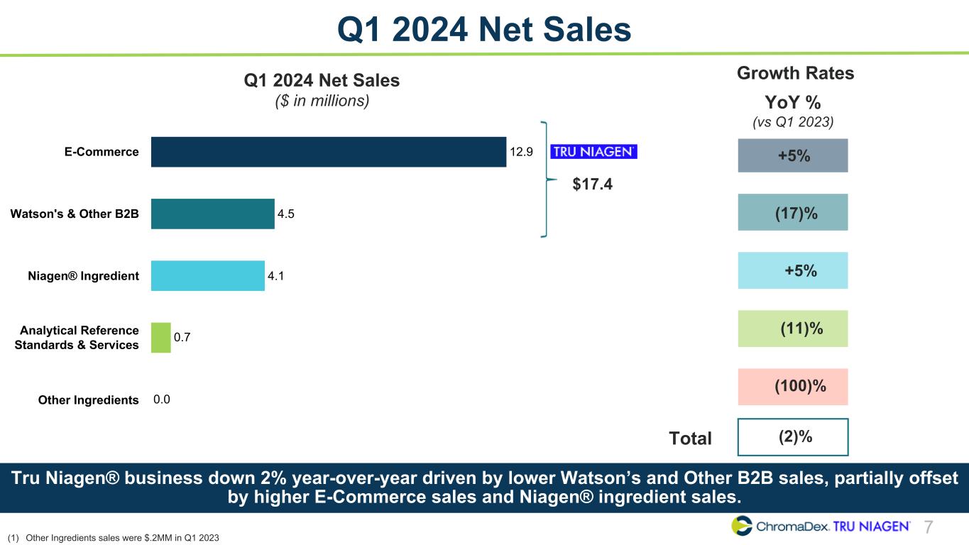 6 Q1 2024 Net Sales Mix E-Commerce 54% Watson's & Other B2B 24% Niagen® Ingredient 17% Analytical Reference Standards & Services 4% Other Ingredients 1% Q1 2023 $22.5 MM E-Commerce 58% Watson's & Other B2B 20% Niagen® Ingredient 19% Analytical Reference Standards & Services 3% $22.2 MM Q1 2024 • Tru Niagen® net sales remained at 78% of net sales for Q1 2024 and Q1 2023(1) • Niagen®-related net sales increased to 97% of net sales in Q1 2024 compared to 95% in Q1 2023(2) Higher mix of Niagen®-related sales in Q1 2024 compared to the prior year, driven by stronger E-Commerce sales and Niagen® ingredient sales. (1) Tru Niagen® net sales include E-Commerce, Watson’s/Other B2B (2) Niagen®-related sales include Tru Niagen® and Niagen® ingredient