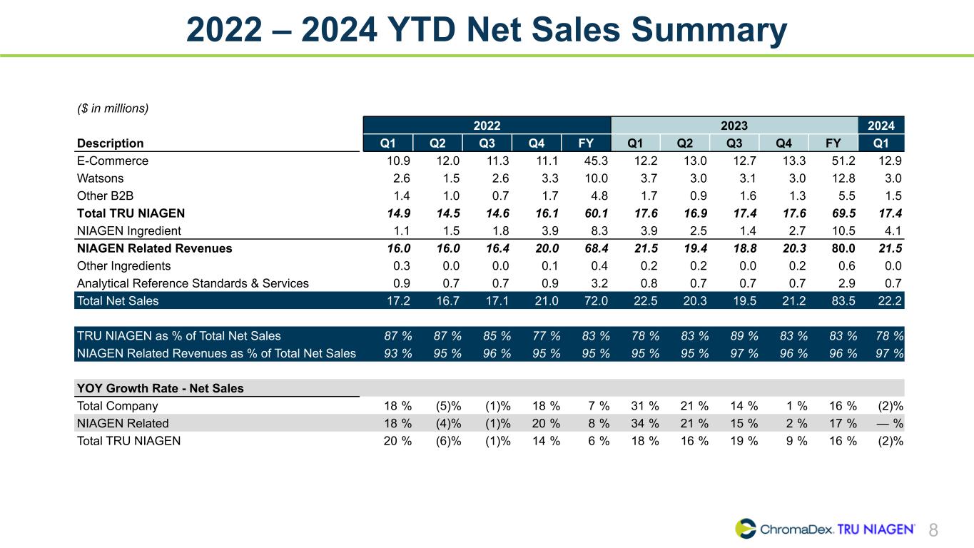 7 Q1 2024 Net Sales Q1 2024 Net Sales ($ in millions) 12.9 4.5 4.1 0.7 0.0 E-Commerce Watson's & Other B2B Niagen® Ingredient Analytical Reference Standards & Services Other Ingredients $17.4 YoY % (vs Q1 2023) +5% (17)% +5% (11)% (100)% (2)% Tru Niagen® business down 2% year-over-year driven by lower Watson’s and Other B2B sales, partially offset by higher E-Commerce sales and Niagen® ingredient sales. Total Growth Rates (1) Other Ingredients sales were $.2MM in Q1 2023