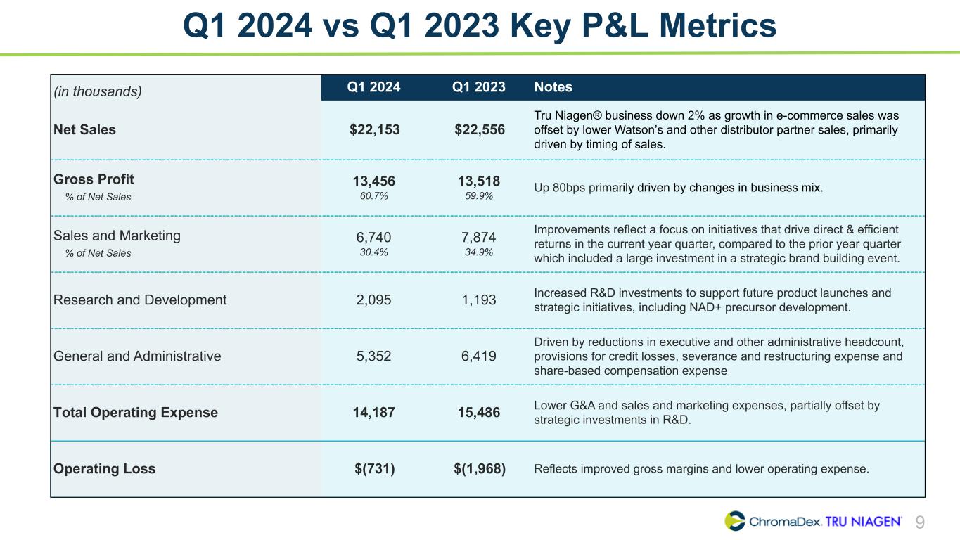 8 2022 – 2024 YTD Net Sales Summary ($ in millions) 2022 2023 2024 Description Q1 Q2 Q3 Q4 FY Q1 Q2 Q3 Q4 FY Q1 E-Commerce 10.9 12.0 11.3 11.1 45.3 12.2 13.0 12.7 13.3 51.2 12.9 Watsons 2.6 1.5 2.6 3.3 10.0 3.7 3.0 3.1 3.0 12.8 3.0 Other B2B 1.4 1.0 0.7 1.7 4.8 1.7 0.9 1.6 1.3 5.5 1.5 Total TRU NIAGEN 14.9 14.5 14.6 16.1 60.1 17.6 16.9 17.4 17.6 69.5 17.4 NIAGEN Ingredient 1.1 1.5 1.8 3.9 8.3 3.9 2.5 1.4 2.7 10.5 4.1 NIAGEN Related Revenues 16.0 16.0 16.4 20.0 68.4 21.5 19.4 18.8 20.3 80.0 21.5 Other Ingredients 0.3 0.0 0.0 0.1 0.4 0.2 0.2 0.0 0.2 0.6 0.0 Analytical Reference Standards & Services 0.9 0.7 0.7 0.9 3.2 0.8 0.7 0.7 0.7 2.9 0.7 Total Net Sales 17.2 16.7 17.1 21.0 72.0 22.5 20.3 19.5 21.2 83.5 22.2 TRU NIAGEN as % of Total Net Sales 87 % 87 % 85 % 77 % 83 % 78 % 83 % 89 % 83 % 83 % 78 % NIAGEN Related Revenues as % of Total Net Sales 93 % 95 % 96 % 95 % 95 % 95 % 95 % 97 % 96 % 96 % 97 % YOY Growth Rate - Net Sales Total Company 18 % (5) % (1) % 18 % 7 % 31 % 21 % 14 % 1 % 16 % (2) % NIAGEN Related 18 % (4) % (1) % 20 % 8 % 34 % 21 % 15 % 2 % 17 % — % Total TRU NIAGEN 20 % (6) % (1) % 14 % 6 % 18 % 16 % 19 % 9 % 16 % (2) %