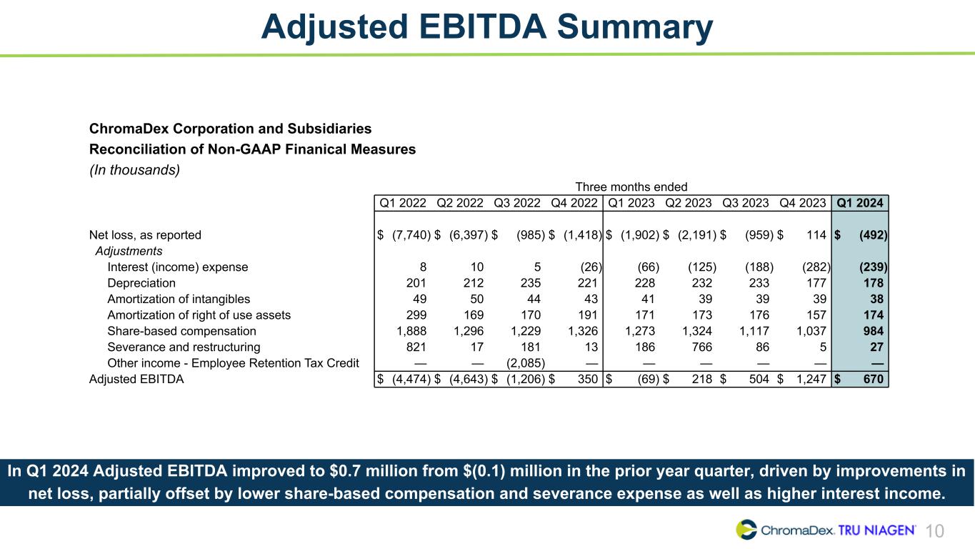 9 Q1 2024 vs Q1 2023 Key P&L Metrics (in thousands) Q1 2024 Q1 2023 Notes Net Sales $22,153 $22,556 Tru Niagen® business down 2% as growth in e-commerce sales was offset by lower Watson’s and other distributor partner sales, primarily driven by timing of sales. Gross Profit % of Net Sales 13,456 60.7% 13,518 59.9% Up 80bps primarily driven by changes in business mix. Sales and Marketing % of Net Sales 6,740 30.4% 7,874 34.9% Improvements reflect a focus on initiatives that drive direct & efficient returns in the current year quarter, compared to the prior year quarter which included a large investment in a strategic brand building event. Research and Development 2,095 1,193 Increased R&D investments to support future product launches and strategic initiatives, including NAD+ precursor development. General and Administrative 5,352 6,419 Driven by reductions in executive and other administrative headcount, provisions for credit losses, severance and restructuring expense and share-based compensation expense Total Operating Expense 14,187 15,486 Lower G&A and sales and marketing expenses, partially offset by strategic investments in R&D. Operating Loss $(731) $(1,968) Reflects improved gross margins and lower operating expense.