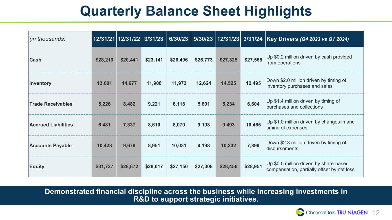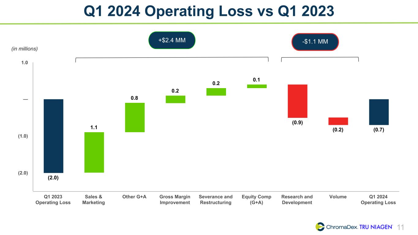 10 Adjusted EBITDA Summary In Q1 2024 Adjusted EBITDA improved to $0.7 million from $(0.1) million in the prior year quarter, driven by improvements in net loss, partially offset by lower share-based compensation and severance expense as well as higher interest income. ChromaDex Corporation and Subsidiaries Reconciliation of Non-GAAP Finanical Measures (In thousands) Three months ended Q1 2022 Q2 2022 Q3 2022 Q4 2022 Q1 2023 Q2 2023 Q3 2023 Q4 2023 Q1 2024 Net loss, as reported $ (7,740) $ (6,397) $ (985) $ (1,418) $ (1,902) $ (2,191) $ (959) $ 114 $ (492) Adjustments Interest (income) expense 8 10 5 (26) (66) (125) (188) (282) (239) Depreciation 201 212 235 221 228 232 233 177 178 Amortization of intangibles 49 50 44 43 41 39 39 39 38 Amortization of right of use assets 299 169 170 191 171 173 176 157 174 Share-based compensation 1,888 1,296 1,229 1,326 1,273 1,324 1,117 1,037 984 Severance and restructuring 821 17 181 13 186 766 86 5 27 Other income - Employee Retention Tax Credit — — (2,085) — — — — — — Adjusted EBITDA $ (4,474) $ (4,643) $ (1,206) $ 350 $ (69) $ 218 $ 504 $ 1,247 $ 670