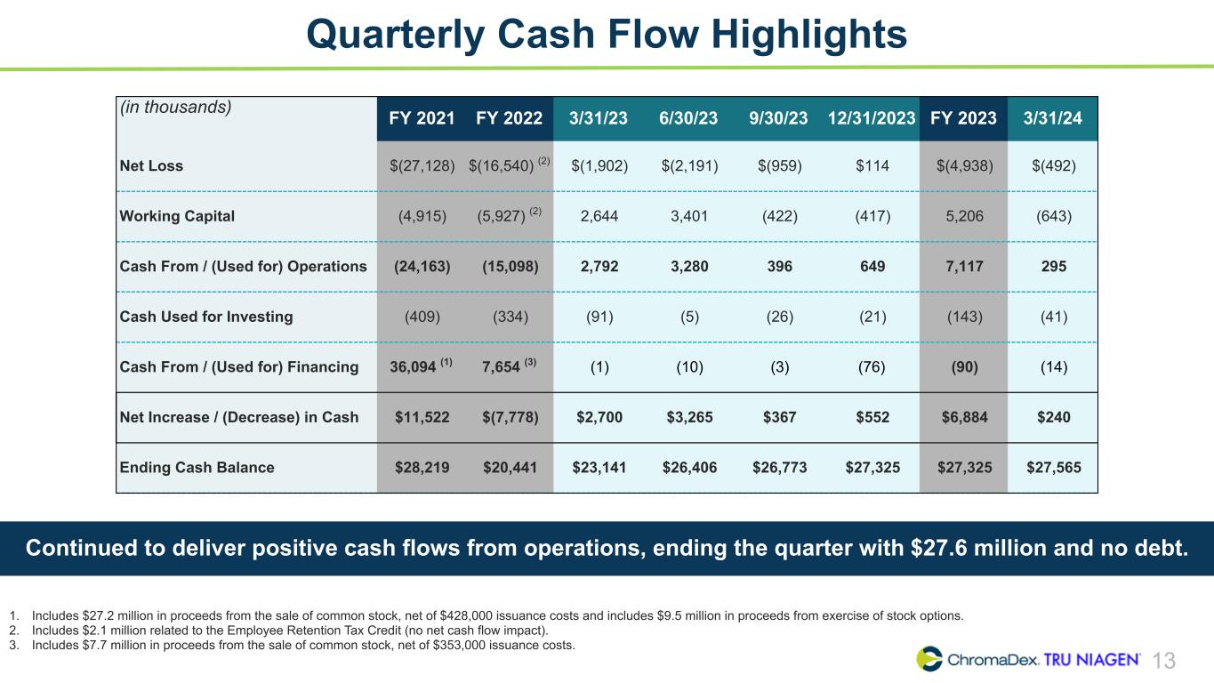12 Quarterly Balance Sheet Highlights (in thousands) 12/31/21 12/31/22 3/31/23 6/30/23 9/30/23 12/31/23 3/31/24 Key Drivers (Q4 2023 vs Q1 2024) Cash $28,219 $20,441 $23,141 $26,406 $26,773 $27,325 $27,565 Up $0.2 million driven by cash provided from operations Inventory 13,601 14,677 11,908 11,973 12,624 14,525 12,495 Down $2.0 million driven by timing of inventory purchases and sales Trade Receivables 5,226 8,482 9,221 6,118 5,601 5,234 6,604 Up $1.4 million driven by timing of purchases and collections Accrued Liabilities 6,481 7,337 8,610 8,079 9,193 9,493 10,465 Up $1.0 million driven by changes in and timing of expenses Accounts Payable 10,423 9,679 8,951 10,031 9,198 10,232 7,899 Down $2.3 million driven by timing of disbursements Equity $31,727 $28,672 $28,017 $27,150 $27,308 $28,456 $28,951 Up $0.5 million driven by share-based compensation, partially offset by net loss Demonstrated financial discipline across the business while increasing investments in R&D to support strategic initiatives.