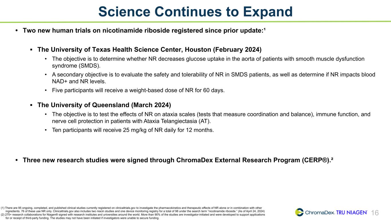 16 Science Continues to Expand (1) There are 95 ongoing, completed, and published clinical studies currently registered on clinicaltrials.gov to investigate the pharmacokinetics and therapeutic effects of NR alone or in combination with other ingredients. 76 of these use NR only. Clinicaltrials.gov also includes two niacin studies and one device monitoring registry for a total of 98 under the search term “nicotinamide riboside.” (As of April 24, 2024) (2) 275+ research collaborations for Niagen® signed with research institutes and universities around the world. More than 90% of the studies are investigator-initiated and were developed to support applications for or receipt of third-party funding. The studies may not have been initiated if investigators were unable to secure funding. • Two new human trials on nicotinamide riboside registered since prior update:¹ ▪ The University of Texas Health Science Center, Houston (February 2024) • The objective is to determine whether NR decreases glucose uptake in the aorta of patients with smooth muscle dysfunction syndrome (SMDS). • A secondary objective is to evaluate the safety and tolerability of NR in SMDS patients, as well as determine if NR impacts blood NAD+ and NR levels. • Five participants will receive a weight-based dose of NR for 60 days. ▪ The University of Queensland (March 2024) • The objective is to test the effects of NR on ataxia scales (tests that measure coordination and balance), immune function, and nerve cell protection in patients with Ataxia Telangiectasia (AT). • Ten participants will receive 25 mg/kg of NR daily for 12 months. • Three new research studies were signed through ChromaDex External Research Program (CERP®).²