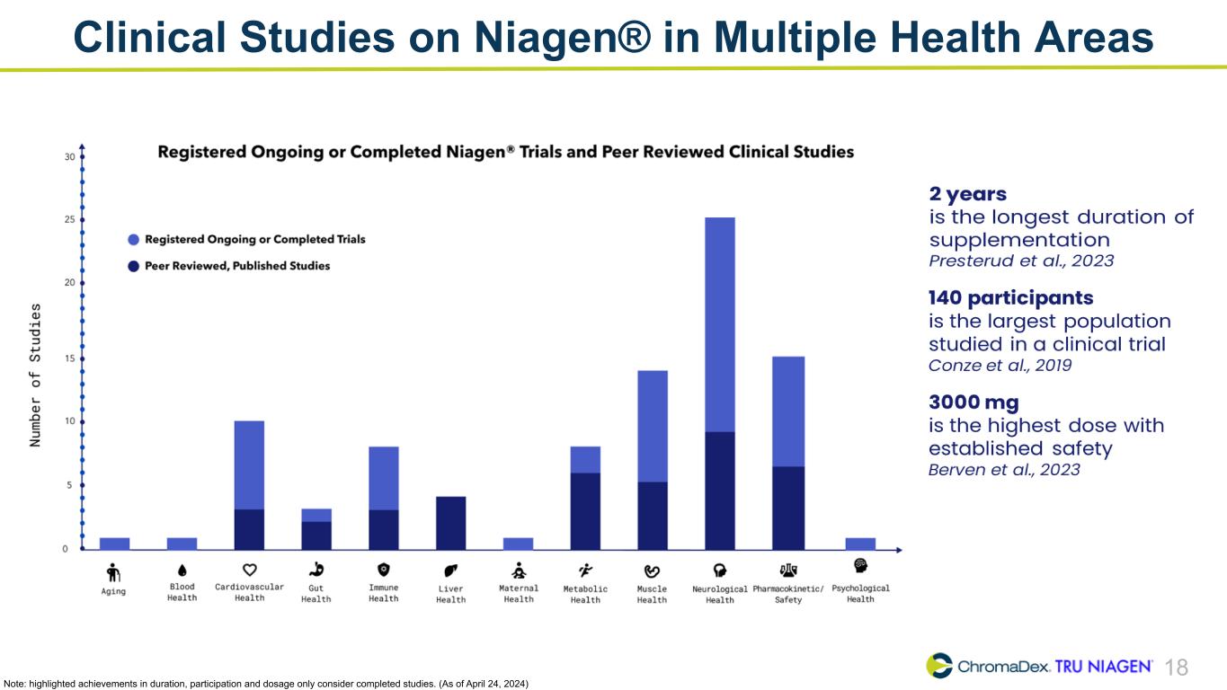 18 Clinical Studies on Niagen® in Multiple Health Areas Note: highlighted achievements in duration, participation and dosage only consider completed studies. (As of April 24, 2024)