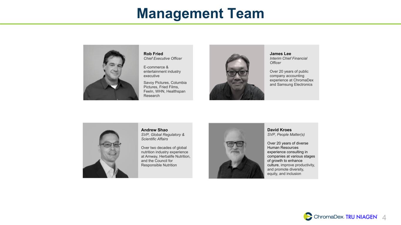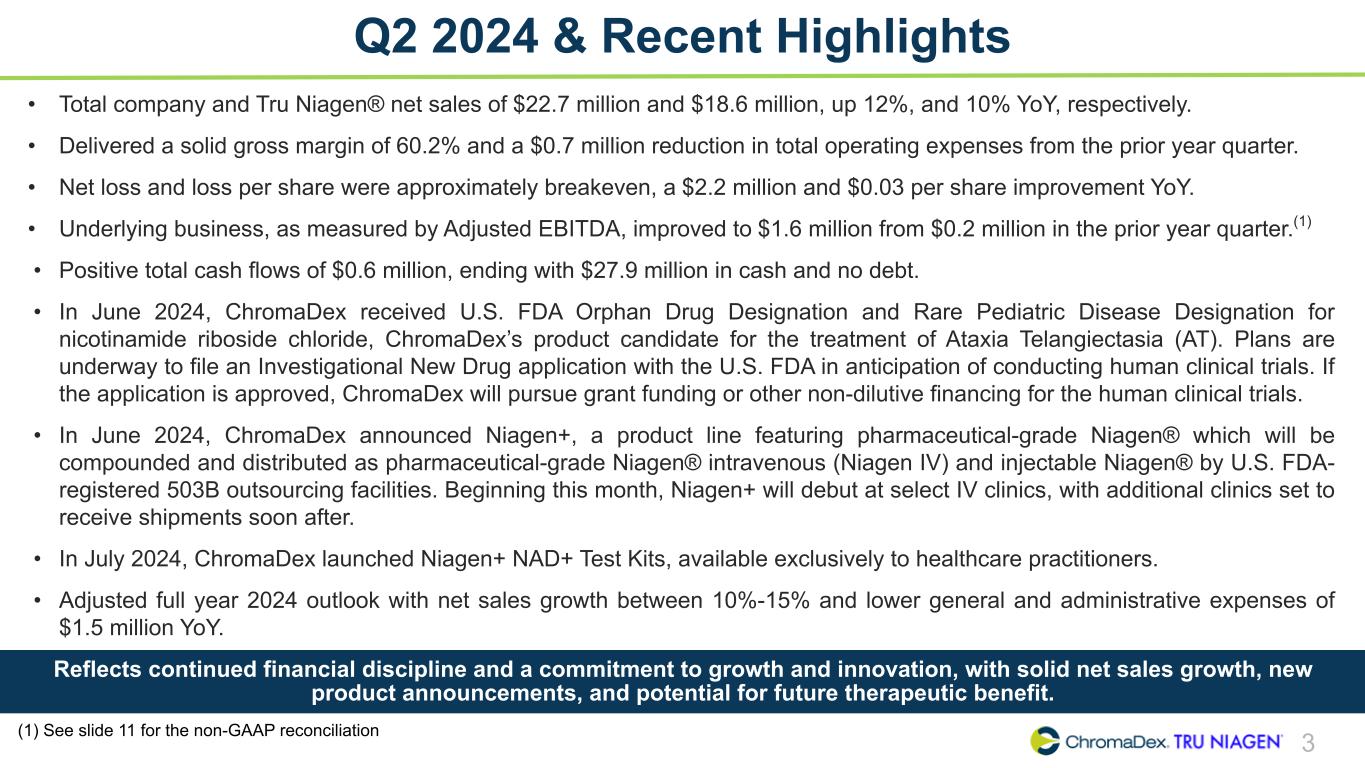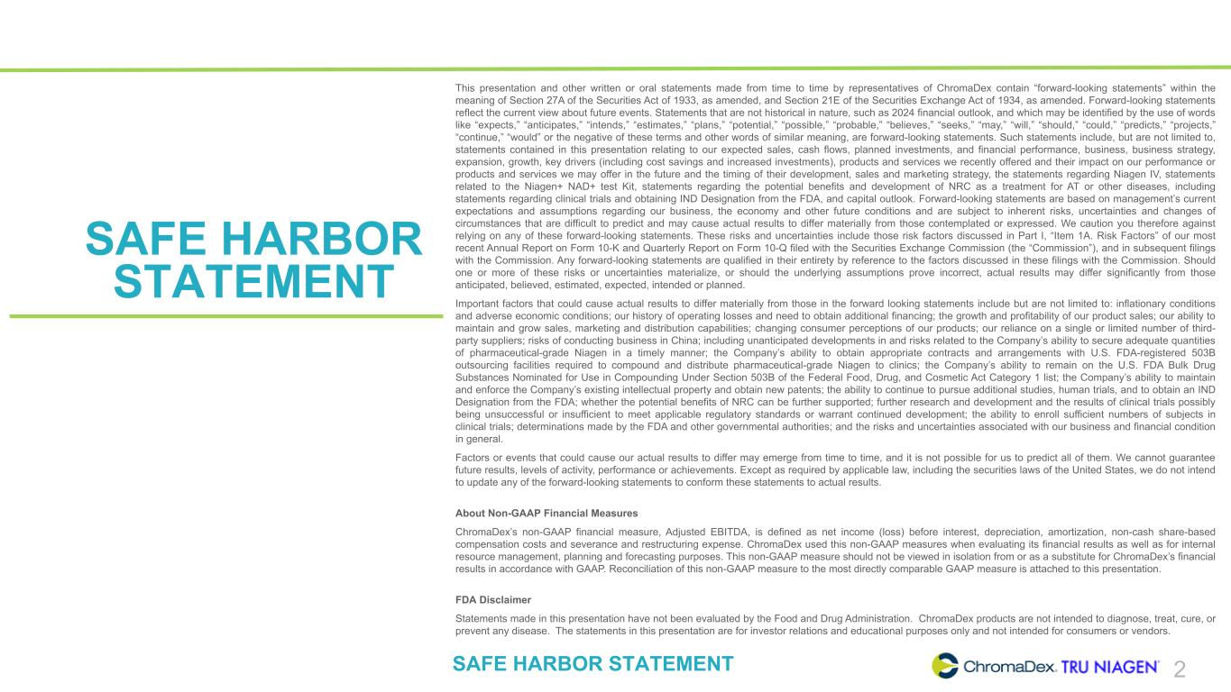 SAFE HARBOR STATEMENT SAFE HARBOR STATEMENT 2 This presentation and other written or oral statements made from time to time by representatives of ChromaDex contain “forward-looking statements” within the meaning of Section 27A of the Securities Act of 1933, as amended, and Section 21E of the Securities Exchange Act of 1934, as amended. Forward-looking statements reflect the current view about future events. Statements that are not historical in nature, such as 2024 financial outlook, and which may be identified by the use of words like “expects,” “anticipates,” “intends,” “estimates,” “plans,” “potential,” “possible,” “probable,” “believes,” “seeks,” “may,” “will,” “should,” “could,” “predicts,” “projects,” “continue,” “would” or the negative of these terms and other words of similar meaning, are forward-looking statements. Such statements include, but are not limited to, statements contained in this presentation relating to our expected sales, cash flows, planned investments, and financial performance, business, business strategy, expansion, growth, key drivers (including cost savings and increased investments), products and services we recently offered and their impact on our performance or products and services we may offer in the future and the timing of their development, sales and marketing strategy, the statements regarding Niagen IV, statements related to the Niagen+ NAD+ test Kit, statements regarding the potential benefits and development of NRC as a treatment for AT or other diseases, including statements regarding clinical trials and obtaining IND Designation from the FDA, and capital outlook. Forward-looking statements are based on management’s current expectations and assumptions regarding our business, the economy and other future conditions and are subject to inherent risks, uncertainties and changes of circumstances that are difficult to predict and may cause actual results to differ materially from those contemplated or expressed. We caution you therefore against relying on any of these forward-looking statements. These risks and uncertainties include those risk factors discussed in Part I, “Item 1A. Risk Factors” of our most recent Annual Report on Form 10-K and Quarterly Report on Form 10-Q filed with the Securities Exchange Commission (the “Commission”), and in subsequent filings with the Commission. Any forward-looking statements are qualified in their entirety by reference to the factors discussed in these filings with the Commission. Should one or more of these risks or uncertainties materialize, or should the underlying assumptions prove incorrect, actual results may differ significantly from those anticipated, believed, estimated, expected, intended or planned. Important factors that could cause actual results to differ materially from those in the forward looking statements include but are not limited to: inflationary conditions and adverse economic conditions; our history of operating losses and need to obtain additional financing; the growth and profitability of our product sales; our ability to maintain and grow sales, marketing and distribution capabilities; changing consumer perceptions of our products; our reliance on a single or limited number of third- party suppliers; risks of conducting business in China; including unanticipated developments in and risks related to the Company’s ability to secure adequate quantities of pharmaceutical-grade Niagen in a timely manner; the Company’s ability to obtain appropriate contracts and arrangements with U.S. FDA-registered 503B outsourcing facilities required to compound and distribute pharmaceutical-grade Niagen to clinics; the Company’s ability to remain on the U.S. FDA Bulk Drug Substances Nominated for Use in Compounding Under Section 503B of the Federal Food, Drug, and Cosmetic Act Category 1 list; the Company’s ability to maintain and enforce the Company’s existing intellectual property and obtain new patents; the ability to continue to pursue additional studies, human trials, and to obtain an IND Designation from the FDA; whether the potential benefits of NRC can be further supported; further research and development and the results of clinical trials possibly being unsuccessful or insufficient to meet applicable regulatory standards or warrant continued development; the ability to enroll sufficient numbers of subjects in clinical trials; determinations made by the FDA and other governmental authorities; and the risks and uncertainties associated with our business and financial condition in general. Factors or events that could cause our actual results to differ may emerge from time to time, and it is not possible for us to predict all of them. We cannot guarantee future results, levels of activity, performance or achievements. Except as required by applicable law, including the securities laws of the United States, we do not intend to update any of the forward-looking statements to conform these statements to actual results. About Non-GAAP Financial Measures ChromaDex’s non-GAAP financial measure, Adjusted EBITDA, is defined as net income (loss) before interest, depreciation, amortization, non-cash share-based compensation costs and severance and restructuring expense. ChromaDex used this non-GAAP measures when evaluating its financial results as well as for internal resource management, planning and forecasting purposes. This non-GAAP measure should not be viewed in isolation from or as a substitute for ChromaDex’s financial results in accordance with GAAP. Reconciliation of this non-GAAP measure to the most directly comparable GAAP measure is attached to this presentation. FDA Disclaimer Statements made in this presentation have not been evaluated by the Food and Drug Administration. ChromaDex products are not intended to diagnose, treat, cure, or prevent any disease. The statements in this presentation ar