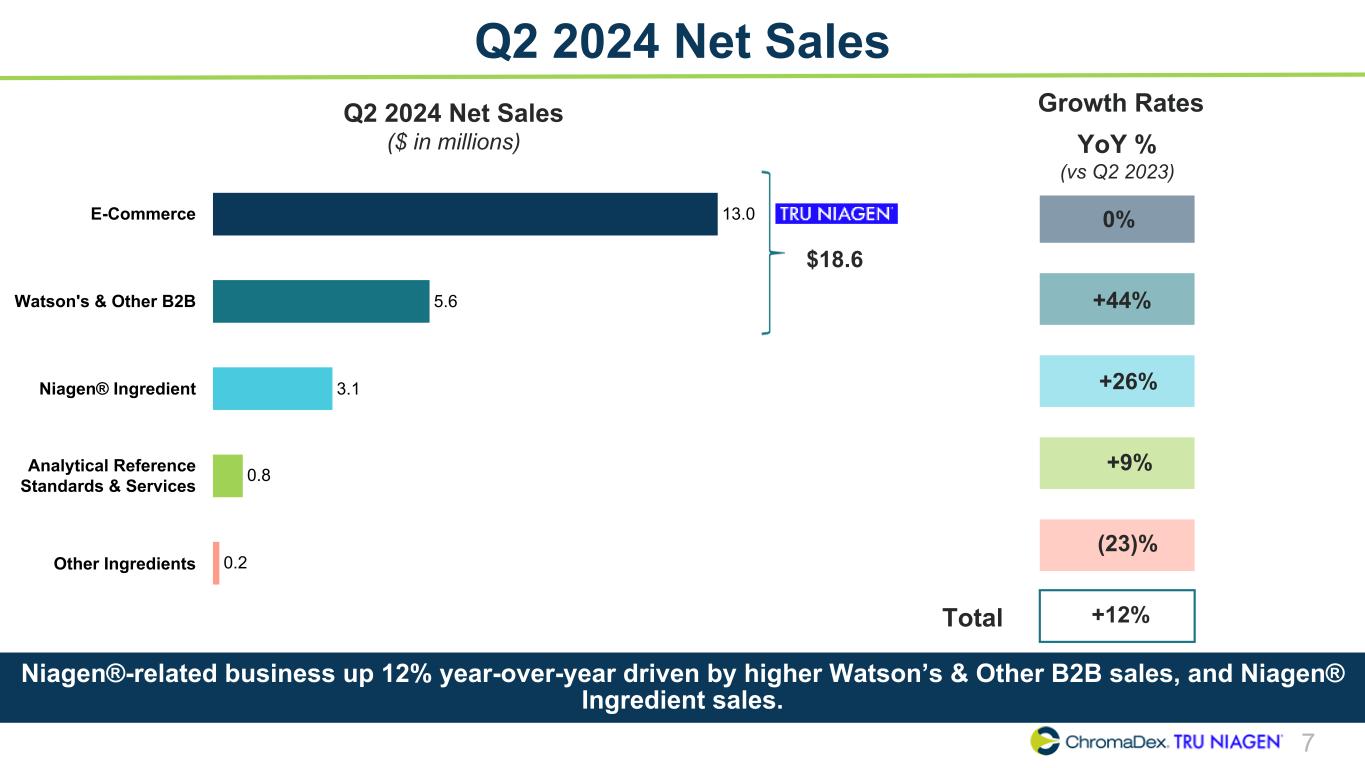 6 Q2 2024 Net Sales Mix E-Commerce 64% Watson's & Other B2B 19% Niagen® Ingredient 12% Analytical Reference Standards & Services 4% Other Ingredients 1% Q2 2023 $20.3 MM E-Commerce 57% Watson's & Other B2B 25% Niagen® Ingredient 14% Analytical Reference Standards & Services 3% Other Ingredients 1% $22.7 MM Q2 2024 • Tru Niagen® net sales decreased to 82% of net sales in Q2 2024 compared to 83% in Q2 2023(1) • Niagen®-related net sales increased to 96% of net sales in Q2 2024 compared to 95% in Q2 2023(2) Higher mix of Niagen®-related sales in Q2 2024 compared to the prior year, driven by stronger Niagen® Ingredient and Other B2B sales. (1) Tru Niagen® net sales include E-Commerce, Watson’s/Other B2B (2) Niagen®-related sales include Tru Niagen® and Niagen® ingredient