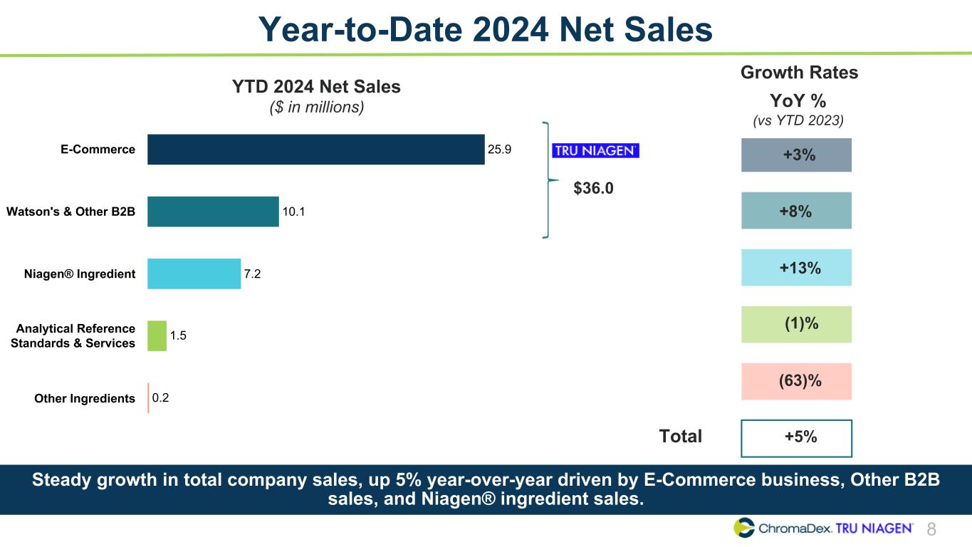 7 Q2 2024 Net Sales Q2 2024 Net Sales ($ in millions) 13.0 5.6 3.1 0.8 0.2 E-Commerce Watson's & Other B2B Niagen® Ingredient Analytical Reference Standards & Services Other Ingredients $18.6 YoY % (vs Q2 2023) 0% +44% +26% +9% (23)% +12% Niagen®-related business up 12% year-over-year driven by higher Watson’s & Other B2B sales, and Niagen® Ingredient sales. Total Growth Rates