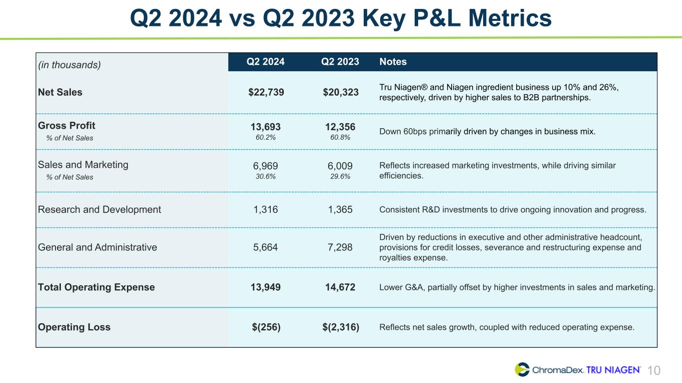 9 2022 – 2024 YTD Net Sales Summary ($ in millions) 2022 2023 2024 Description Q1 Q2 Q3 Q4 FY Q1 Q2 Q3 Q4 FY Q1 Q2 E-Commerce 10.9 12.0 11.3 11.1 45.3 12.2 13.0 12.7 13.3 51.2 12.9 13.0 Watsons 2.6 1.5 2.6 3.3 10.0 3.7 3.0 3.1 3.0 12.8 3.0 3.7 Other B2B 1.4 1.0 0.7 1.7 4.8 1.7 0.9 1.6 1.3 5.5 1.5 1.9 Total TRU NIAGEN 14.9 14.5 14.6 16.1 60.1 17.6 16.9 17.4 17.6 69.5 17.4 18.6 NIAGEN Ingredient 1.1 1.5 1.8 3.9 8.3 3.9 2.5 1.4 2.7 10.5 4.1 3.1 NIAGEN Related Revenues 16.0 16.0 16.4 20.0 68.4 21.5 19.4 18.8 20.3 80.0 21.5 21.7 Other Ingredients 0.3 0.0 0.0 0.1 0.4 0.2 0.2 0.0 0.2 0.6 0.0 0.2 Analytical Reference Standards & Services 0.9 0.7 0.7 0.9 3.2 0.8 0.7 0.7 0.7 2.9 0.7 0.8 Total Net Sales 17.2 16.7 17.1 21.0 72.0 22.5 20.3 19.5 21.2 83.5 22.2 22.7 TRU NIAGEN as % of Total Net Sales 87 % 87 % 85 % 77 % 83 % 78 % 83 % 89 % 83 % 83 % 78 % 82 % NIAGEN Related Revenues as % of Total Net Sales 93 % 95 % 96 % 95 % 95 % 95 % 95 % 97 % 96 % 96 % 97 % 96 % YOY Growth Rate - Net Sales Total Company 18 % (5) % (1) % 18 % 7 % 31 % 21 % 14 % 1 % 16 % (2) % 12 % NIAGEN Related 18 % (4) % (1) % 20 % 8 % 34 % 21 % 15 % 2 % 17 % — % 12 % Total TRU NIAGEN 20 % (6) % (1) % 14 % 6 % 18 % 16 % 19 % 9 % 16 % (2) % 10 %