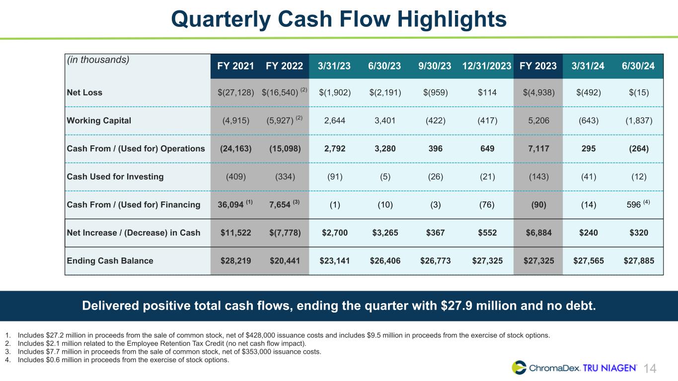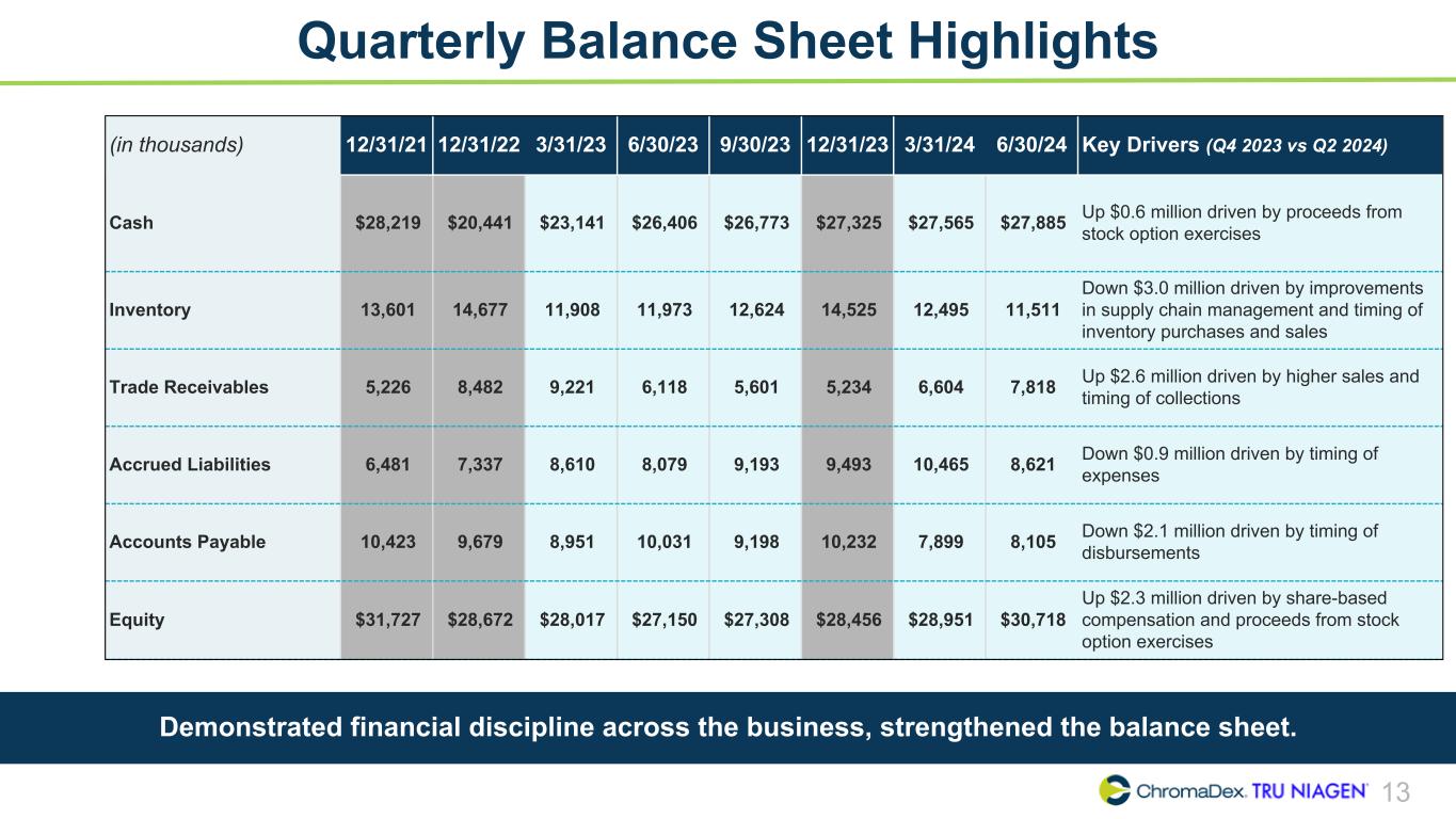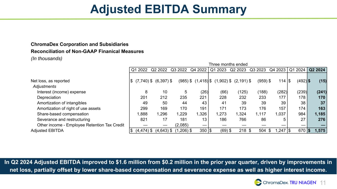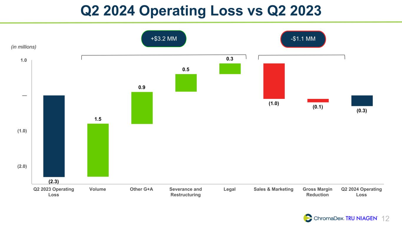 11 Adjusted EBITDA Summary In Q2 2024 Adjusted EBITDA improved to $1.6 million from $0.2 million in the prior year quarter, driven by improvements in net loss, partially offset by lower share-based compensation and severance expense as well as higher interest income. ChromaDex Corporation and Subsidiaries Reconciliation of Non-GAAP Finanical Measures (In thousands) Three months ended Q1 2022 Q2 2022 Q3 2022 Q4 2022 Q1 2023 Q2 2023 Q3 2023 Q4 2023 Q1 2024 Q2 2024 Net loss, as reported $ (7,740) $ (6,397) $ (985) $ (1,418) $ (1,902) $ (2,191) $ (959) $ 114 $ (492) $ (15) Adjustments Interest (income) expense 8 10 5 (26) (66) (125) (188) (282) (239) (241) Depreciation 201 212 235 221 228 232 233 177 178 170 Amortization of intangibles 49 50 44 43 41 39 39 39 38 37 Amortization of right of use assets 299 169 170 191 171 173 176 157 174 163 Share-based compensation 1,888 1,296 1,229 1,326 1,273 1,324 1,117 1,037 984 1,185 Severance and restructuring 821 17 181 13 186 766 86 5 27 276 Other income - Employee Retention Tax Credit — — (2,085) — — — — — — — Adjusted EBITDA $ (4,474) $ (4,643) $ (1,206) $ 350 $ (69) $ 218 $ 504 $ 1,247 $ 670 $ 1,575