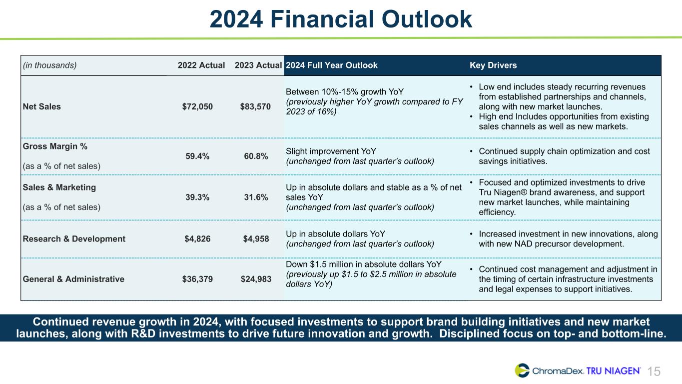 15 2024 Financial Outlook (in thousands) 2022 Actual 2023 Actual 2024 Full Year Outlook Key Drivers Net Sales $72,050 $83,570 Between 10%-15% growth YoY (previously higher YoY growth compared to FY 2023 of 16%) • Low end includes steady recurring revenues from established partnerships and channels, along with new market launches. • High end Includes opportunities from existing sales channels as well as new markets. Gross Margin % (as a % of net sales) 59.4% 60.8% Slight improvement YoY (unchanged from last quarter’s outlook) • Continued supply chain optimization and cost savings initiatives. Sales & Marketing (as a % of net sales) 39.3% 31.6% Up in absolute dollars and stable as a % of net sales YoY (unchanged from last quarter’s outlook) • Focused and optimized investments to drive Tru Niagen® brand awareness, and support new market launches, while maintaining efficiency. Research & Development $4,826 $4,958 Up in absolute dollars YoY (unchanged from last quarter’s outlook) • Increased investment in new innovations, along with new NAD precursor development. General & Administrative $36,379 $24,983 Down $1.5 million in absolute dollars YoY (previously up $1.5 to $2.5 million in absolute dollars YoY) • Continued cost management and adjustment in the timing of certain infrastructure investments and legal expenses to support initiatives. Continued revenue growth in 2024, with focused investments to support brand building initiatives and new market launches, along with R&D investments to drive future innovation and growth. Disciplined focus on top- and bottom-line.