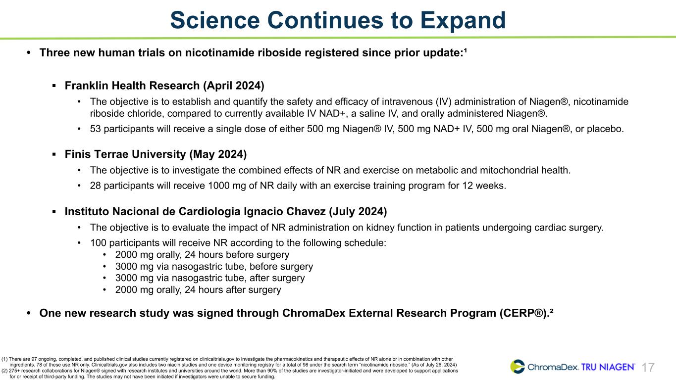 17 Science Continues to Expand (1) There are 97 ongoing, completed, and published clinical studies currently registered on clinicaltrials.gov to investigate the pharmacokinetics and therapeutic effects of NR alone or in combination with other ingredients. 78 of these use NR only. Clinicaltrials.gov also includes two niacin studies and one device monitoring registry for a total of 98 under the search term “nicotinamide riboside.” (As of July 26, 2024) (2) 275+ research collaborations for Niagen® signed with research institutes and universities around the world. More than 90% of the studies are investigator-initiated and were developed to support applications for or receipt of third-party funding. The studies may not have been initiated if investigators were unable to secure funding. • Three new human trials on nicotinamide riboside registered since prior update:¹ ▪ Franklin Health Research (April 2024) • The objective is to establish and quantify the safety and efficacy of intravenous (IV) administration of Niagen®, nicotinamide riboside chloride, compared to currently available IV NAD+, a saline IV, and orally administered Niagen®. • 53 participants will receive a single dose of either 500 mg Niagen® IV, 500 mg NAD+ IV, 500 mg oral Niagen®, or placebo. ▪ Finis Terrae University (May 2024) • The objective is to investigate the combined effects of NR and exercise on metabolic and mitochondrial health. • 28 participants will receive 1000 mg of NR daily with an exercise training program for 12 weeks. ▪ Instituto Nacional de Cardiologia Ignacio Chavez (July 2024) • The objective is to evaluate the impact of NR administration on kidney function in patients undergoing cardiac surgery. • 100 participants will receive NR according to the following schedule: • 2000 mg orally, 24 hours before surgery • 3000 mg via nasogastric tube, before surgery • 3000 mg via nasogastric tube, after surgery • 2000 mg orally, 24 hours after surgery • One new research study was signed through ChromaDex External Research Program (CERP®).²