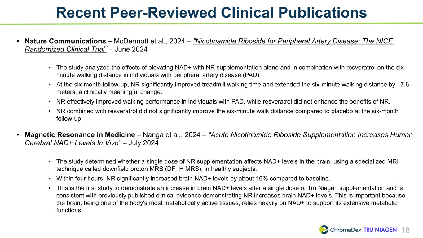 18 Recent Peer-Reviewed Clinical Publications • Nature Communications – McDermott et al., 2024 – “Nicotinamide Riboside for Peripheral Artery Disease: The NICE Randomized Clinical Trial” – June 2024 • The study analyzed the effects of elevating NAD+ with NR supplementation alone and in combination with resveratrol on the six- minute walking distance in individuals with peripheral artery disease (PAD). • At the six-month follow-up, NR significantly improved treadmill walking time and extended the six-minute walking distance by 17.6 meters, a clinically meaningful change. • NR effectively improved walking performance in individuals with PAD, while resveratrol did not enhance the benefits of NR. • NR combined with resveratrol did not significantly improve the six-minute walk distance compared to placebo at the six-month follow-up. • Magnetic Resonance in Medicine – Nanga et al., 2024 – “Acute Nicotinamide Riboside Supplementation Increases Human Cerebral NAD+ Levels In Vivo” – July 2024 • The study determined whether a single dose of NR supplementation affects NAD+ levels in the brain, using a specialized MRI technique called downfield proton MRS (DF 1H MRS), in healthy subjects. • Within four hours, NR significantly increased brain NAD+ levels by about 16% compared to baseline. • This is the first study to demonstrate an increase in brain NAD+ levels after a single dose of Tru Niagen supplementation and is consistent with previously published clinical evidence demonstrating NR increases brain NAD+ levels. This is important because the brain, being one of the body's most metabolically active tissues, relies heavily on NAD+ to support its extensive metabolic functions.