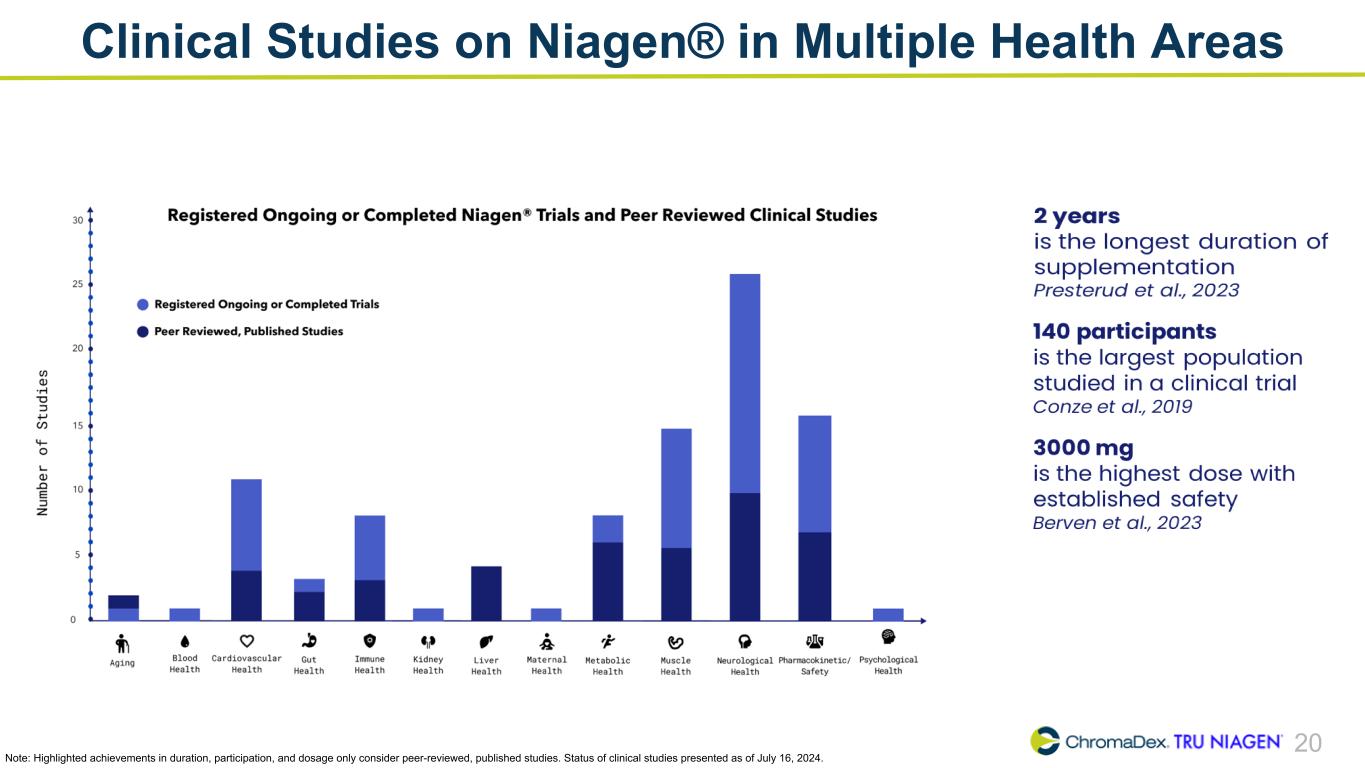 20 Clinical Studies on Niagen® in Multiple Health Areas Note: Highlighted achievements in duration, participation, and dosage only consider peer-reviewed, published studies. Status of clinical studies presented as of July 16, 2024.
