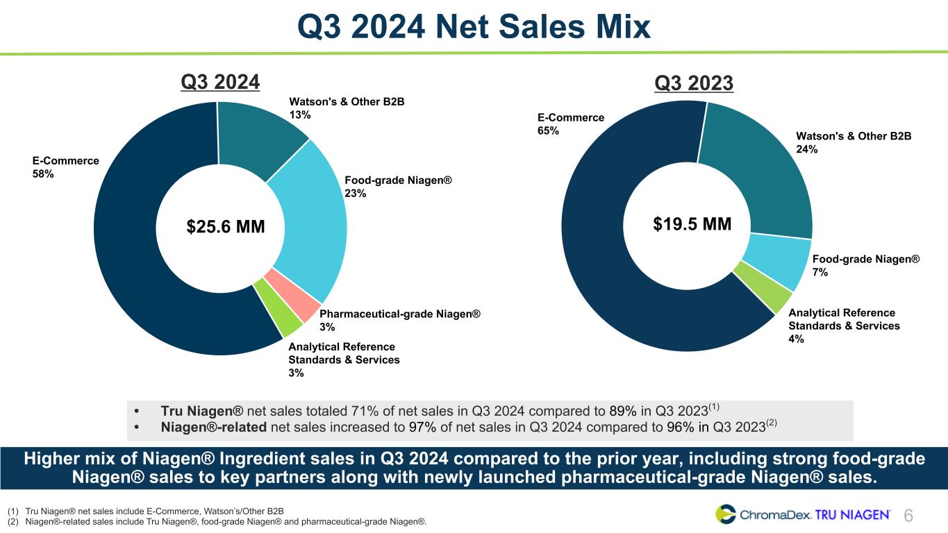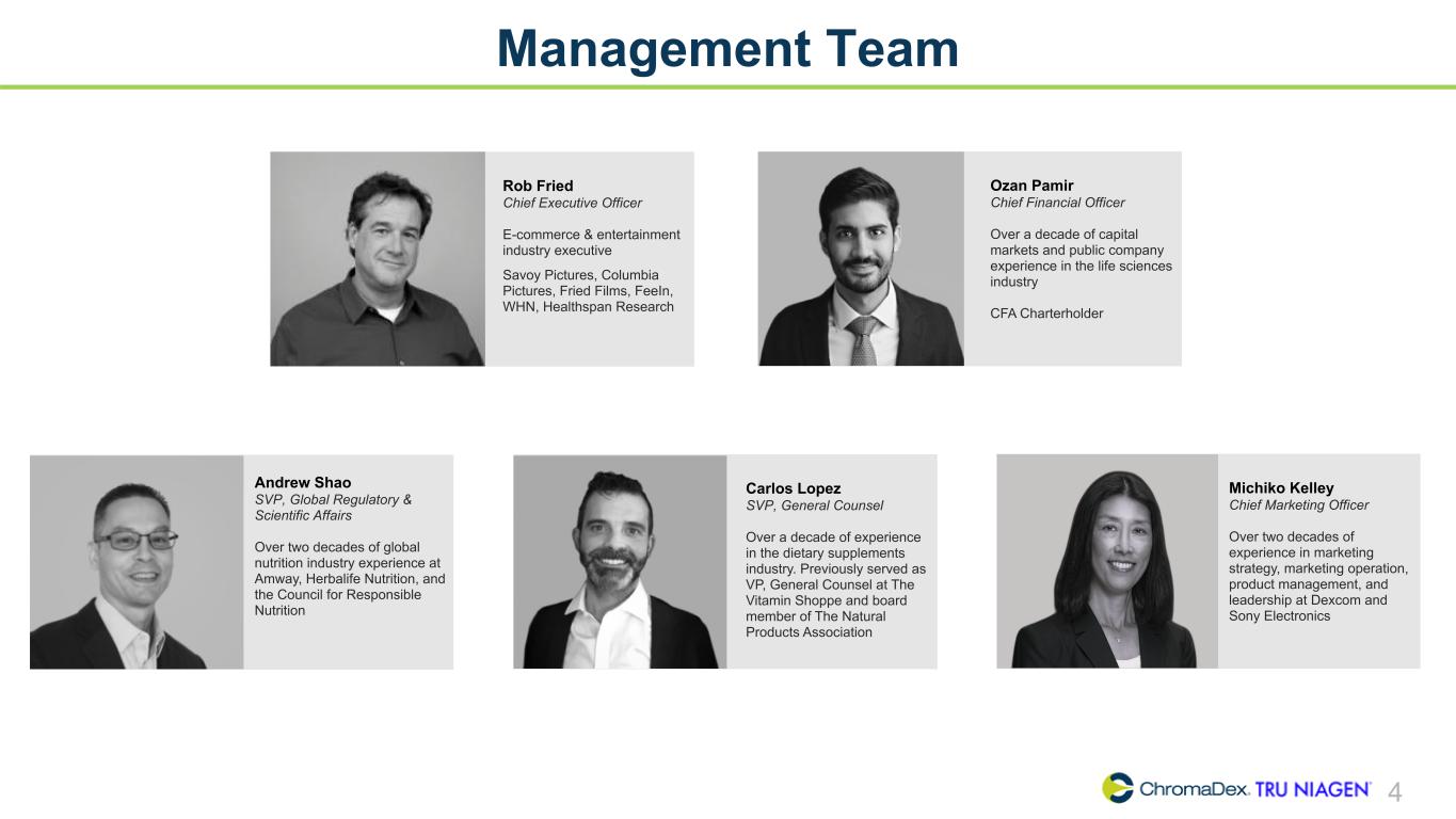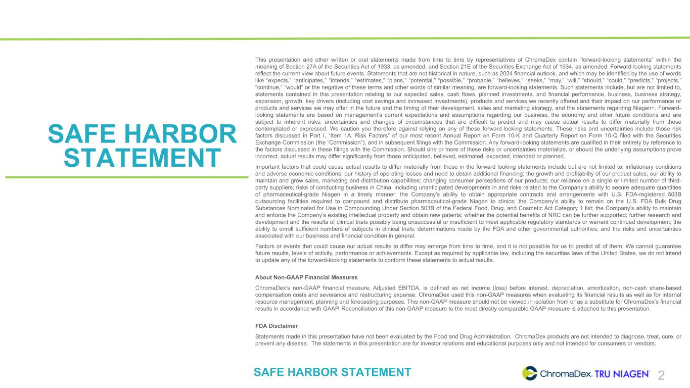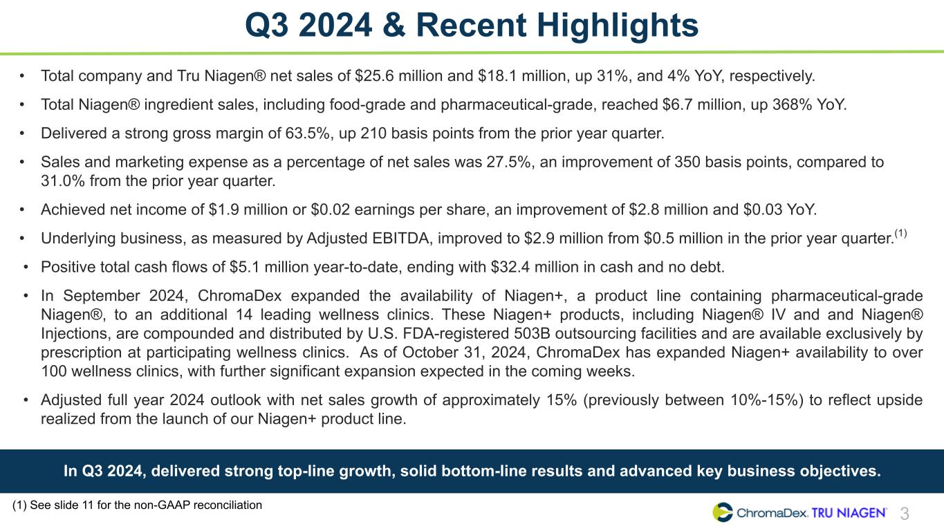 SAFE HARBOR STATEMENT SAFE HARBOR STATEMENT 2 This presentation and other written or oral statements made from time to time by representatives of ChromaDex contain “forward-looking statements” within the meaning of Section 27A of the Securities Act of 1933, as amended, and Section 21E of the Securities Exchange Act of 1934, as amended. Forward-looking statements reflect the current view about future events. Statements that are not historical in nature, such as 2024 financial outlook, and which may be identified by the use of words like “expects,” “anticipates,” “intends,” “estimates,” “plans,” “potential,” “possible,” “probable,” “believes,” “seeks,” “may,” “will,” “should,” “could,” “predicts,” “projects,” “continue,” “would” or the negative of these terms and other words of similar meaning, are forward-looking statements. Such statements include, but are not limited to, statements contained in this presentation relating to our expected sales, cash flows, planned investments, and financial performance, business, business strategy, expansion, growth, key drivers (including cost savings and increased investments), products and services we recently offered and their impact on our performance or products and services we may offer in the future and the timing of their development, sales and marketing strategy, and the statements regarding Niagen+. Forward- looking statements are based on management’s current expectations and assumptions regarding our business, the economy and other future conditions and are subject to inherent risks, uncertainties and changes of circumstances that are difficult to predict and may cause actual results to differ materially from those contemplated or expressed. We caution you therefore against relying on any of these forward-looking statements. These risks and uncertainties include those risk factors discussed in Part I, “Item 1A. Risk Factors” of our most recent Annual Report on Form 10-K and Quarterly Report on Form 10-Q filed with the Securities Exchange Commission (the “Commission”), and in subsequent filings with the Commission. Any forward-looking statements are qualified in their entirety by reference to the factors discussed in these filings with the Commission. Should one or more of these risks or uncertainties materialize, or should the underlying assumptions prove incorrect, actual results may differ significantly from those anticipated, believed, estimated, expected, intended or planned. Important factors that could cause actual results to differ materially from those in the forward looking statements include but are not limited to: inflationary conditions and adverse economic conditions; our history of operating losses and need to obtain additional financing; the growth and profitability of our product sales; our ability to maintain and grow sales, marketing and distribution capabilities; changing consumer perceptions of our products; our reliance on a single or limited number of third- party suppliers; risks of conducting business in China; including unanticipated developments in and risks related to the Company’s ability to secure adequate quantities of pharmaceutical-grade Niagen in a timely manner; the Company’s ability to obtain appropriate contracts and arrangements with U.S. FDA-registered 503B outsourcing facilities required to compound and distribute pharmaceutical-grade Niagen to clinics; the Company’s ability to remain on the U.S. FDA Bulk Drug Substances Nominated for Use in Compounding Under Section 503B of the Federal Food, Drug, and Cosmetic Act Category 1 list; the Company’s ability to maintain and enforce the Company’s existing intellectual property and obtain new patents; whether the potential benefits of NRC can be further supported; further research and development and the results of clinical trials possibly being unsuccessful or insufficient to meet applicable regulatory standards or warrant continued development; the ability to enroll sufficient numbers of subjects in clinical trials; determinations made by the FDA and other governmental authorities; and the risks and uncertainties associated with our business and financial condition in general. Factors or events that could cause our actual results to differ may emerge from time to time, and it is not possible for us to predict all of them. We cannot guarantee future results, levels of activity, performance or achievements. Except as required by applicable law, including the securities laws of the United States, we do not intend to update any of the forward-looking statements to conform these statements to actual results. About Non-GAAP Financial Measures ChromaDex’s non-GAAP financial measure, Adjusted EBITDA, is defined as net income (loss) before interest, depreciation, amortization, non-cash share-based compensation costs and severance and restructuring expense. ChromaDex used this non-GAAP measures when evaluating its financial results as well as for internal resource management, planning and forecasting purposes. This non-GAAP measure should not be viewed in isolation from or as a substitute for ChromaDex’s financial results in accordance with GAAP. Reconciliation of this non-GAAP measure to the most directly comparable GAAP measure is attached to this presentation. FDA Disclaimer Statements made in this presentation have not been evaluated by the Food and Drug Administration. ChromaDex products are not intended to diagnose, treat, cure, or prevent any disease. The statements in this presentation are for investor relations and educational purposes only and not intended for consumers or vendors.