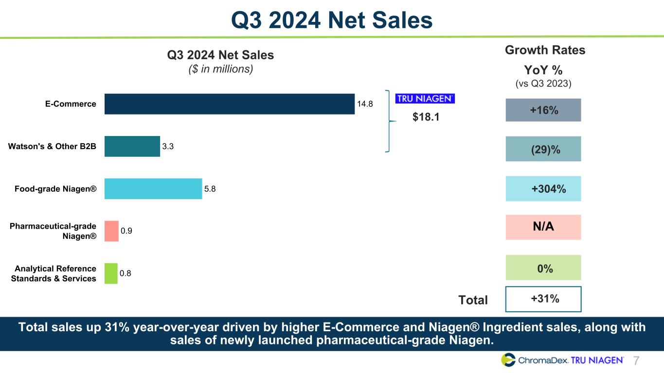 6 Q3 2024 Net Sales Mix E-Commerce 65% Watson's & Other B2B 24% Food-grade Niagen® 7% Analytical Reference Standards & Services 4% Q3 2023 $19.5 MM E-Commerce 58% Watson's & Other B2B 13% Food-grade Niagen® 23% Pharmaceutical-grade Niagen® 3% Analytical Reference Standards & Services 3% $25.6 MM Q3 2024 • Tru Niagen® net sales totaled 71% of net sales in Q3 2024 compared to 89% in Q3 2023(1) • Niagen®-related net sales increased to 97% of net sales in Q3 2024 compared to 96% in Q3 2023(2) Higher mix of Niagen® Ingredient sales in Q3 2024 compared to the prior year, including strong food-grade Niagen® sales to key partners along with newly launched pharmaceutical-grade Niagen® sales. (1) Tru Niagen® net sales include E-Commerce, Watson’s/Other B2B (2) Niagen®-related sales include Tru Niagen®, food-grade Niagen® and pharmaceutical-grade Niagen®.