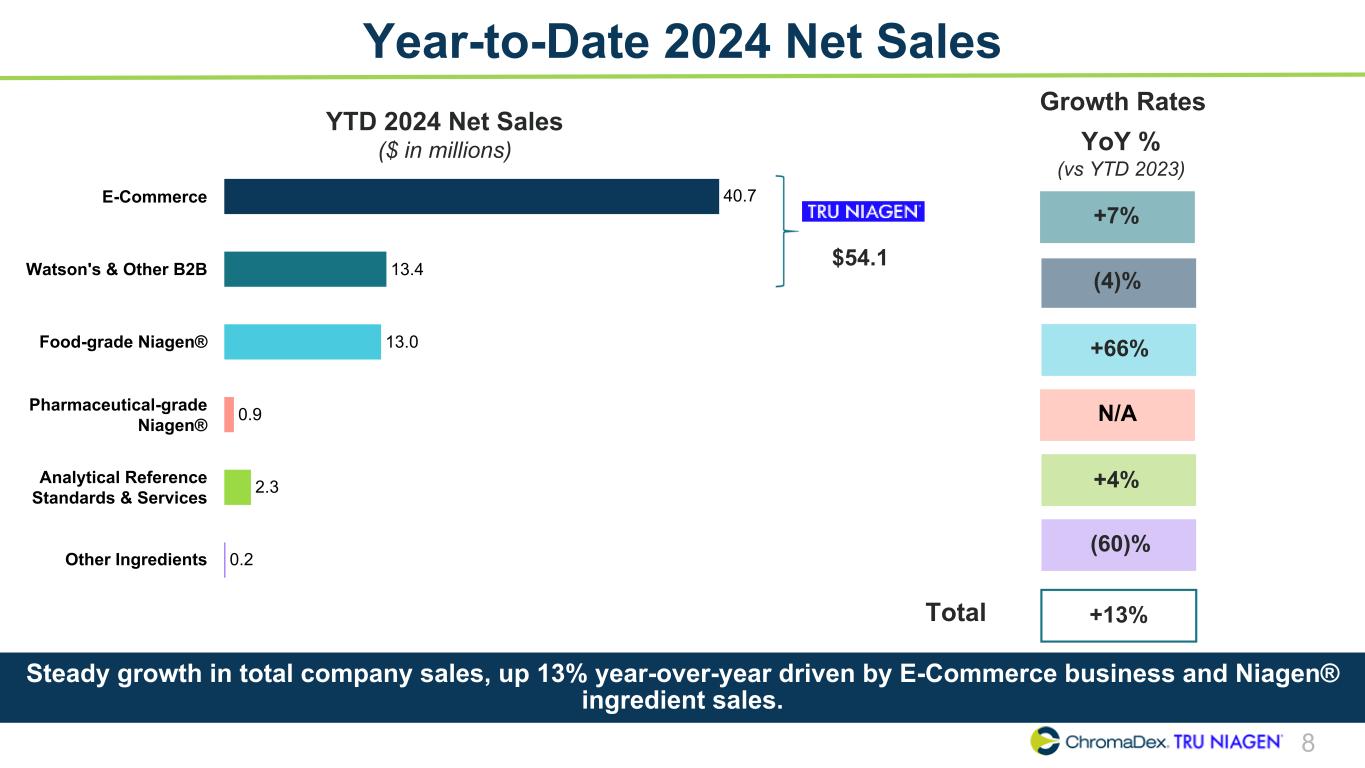 N/A 7 Q3 2024 Net Sales Q3 2024 Net Sales ($ in millions) 14.8 3.3 5.8 0.9 0.8 E-Commerce Watson's & Other B2B Food-grade Niagen® Pharmaceutical-grade Niagen® Analytical Reference Standards & Services $18.1 YoY % (vs Q3 2023) +16% (29)% +304% 0% +31%Total Growth Rates Total sales up 31% year-over-year driven by higher E-Commerce and Niagen® Ingredient sales, along with sales of newly launched pharmaceutical-grade Niagen.
