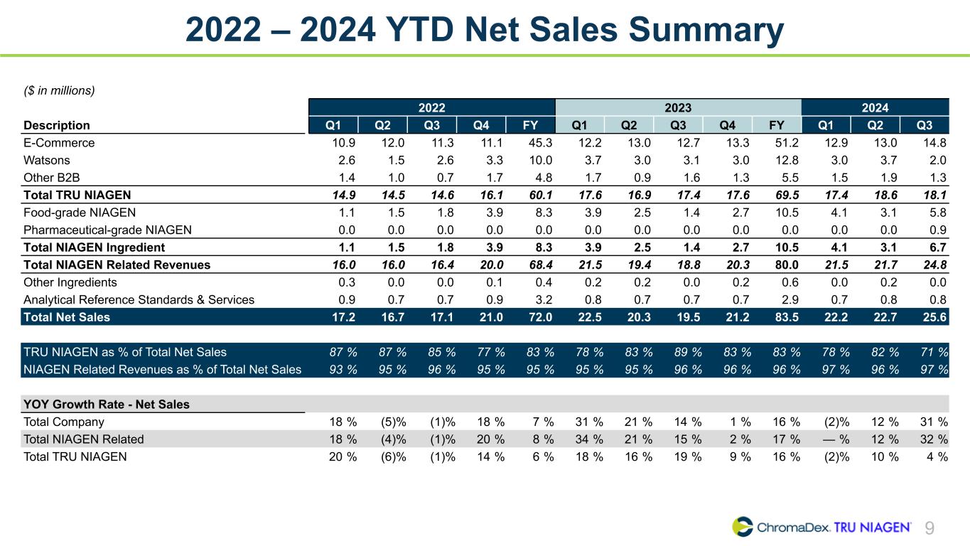 8 Steady growth in total company sales, up 13% year-over-year driven by E-Commerce business and Niagen® ingredient sales. Year-to-Date 2024 Net Sales N/A YTD 2024 Net Sales ($ in millions) Total +13% +7% (4)% +66% +4% (60)% YoY % (vs YTD 2023) $54.1 40.7 13.4 13.0 0.9 2.3 0.2 E-Commerce Watson's & Other B2B Food-grade Niagen® Pharmaceutical-grade Niagen® Analytical Reference Standards & Services Other Ingredients Growth Rates