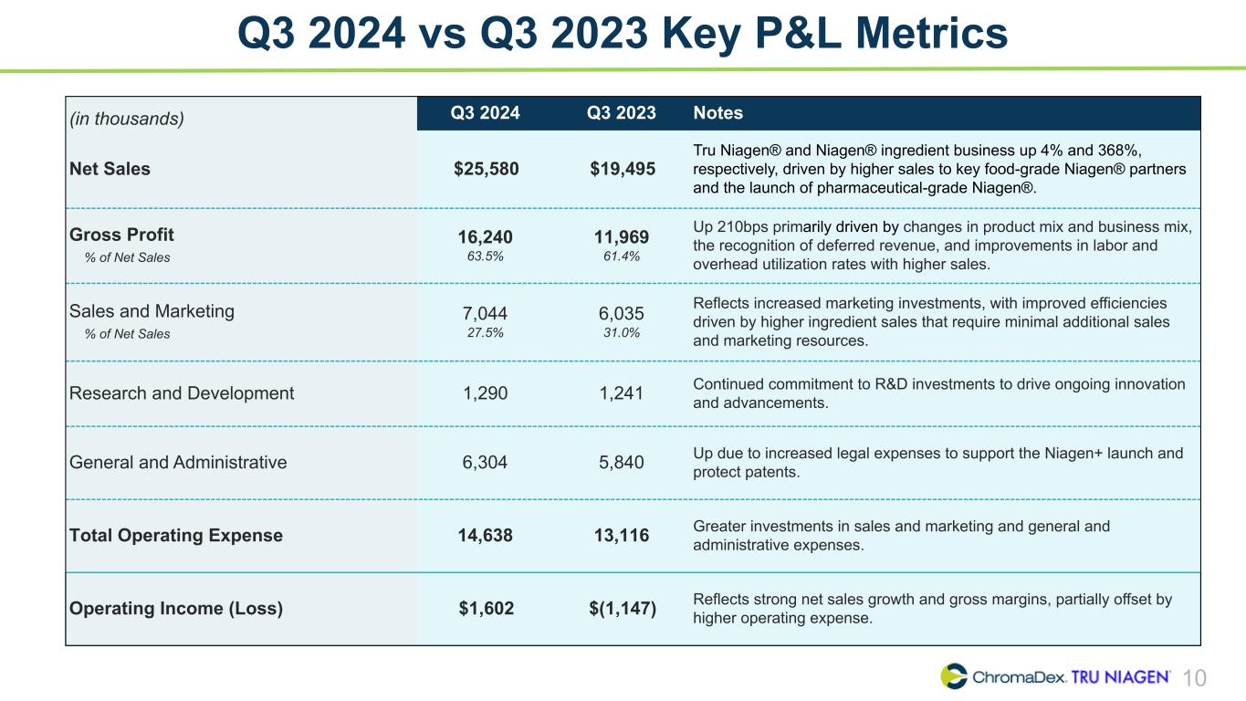 9 2022 – 2024 YTD Net Sales Summary ($ in millions) 2022 2023 2024 Description Q1 Q2 Q3 Q4 FY Q1 Q2 Q3 Q4 FY Q1 Q2 Q3 E-Commerce 10.9 12.0 11.3 11.1 45.3 12.2 13.0 12.7 13.3 51.2 12.9 13.0 14.8 Watsons 2.6 1.5 2.6 3.3 10.0 3.7 3.0 3.1 3.0 12.8 3.0 3.7 2.0 Other B2B 1.4 1.0 0.7 1.7 4.8 1.7 0.9 1.6 1.3 5.5 1.5 1.9 1.3 Total TRU NIAGEN 14.9 14.5 14.6 16.1 60.1 17.6 16.9 17.4 17.6 69.5 17.4 18.6 18.1 Food-grade NIAGEN 1.1 1.5 1.8 3.9 8.3 3.9 2.5 1.4 2.7 10.5 4.1 3.1 5.8 Pharmaceutical-grade NIAGEN 0.0 0.0 0.0 0.0 0.0 0.0 0.0 0.0 0.0 0.0 0.0 0.0 0.9 Total NIAGEN Ingredient 1.1 1.5 1.8 3.9 8.3 3.9 2.5 1.4 2.7 10.5 4.1 3.1 6.7 Total NIAGEN Related Revenues 16.0 16.0 16.4 20.0 68.4 21.5 19.4 18.8 20.3 80.0 21.5 21.7 24.8 Other Ingredients 0.3 0.0 0.0 0.1 0.4 0.2 0.2 0.0 0.2 0.6 0.0 0.2 0.0 Analytical Reference Standards & Services 0.9 0.7 0.7 0.9 3.2 0.8 0.7 0.7 0.7 2.9 0.7 0.8 0.8 Total Net Sales 17.2 16.7 17.1 21.0 72.0 22.5 20.3 19.5 21.2 83.5 22.2 22.7 25.6 TRU NIAGEN as % of Total Net Sales 87 % 87 % 85 % 77 % 83 % 78 % 83 % 89 % 83 % 83 % 78 % 82 % 71 % NIAGEN Related Revenues as % of Total Net Sales 93 % 95 % 96 % 95 % 95 % 95 % 95 % 96 % 96 % 96 % 97 % 96 % 97 % YOY Growth Rate - Net Sales Total Company 18 % (5) % (1) % 18 % 7 % 31 % 21 % 14 % 1 % 16 % (2) % 12 % 31 % Total NIAGEN Related 18 % (4) % (1) % 20 % 8 % 34 % 21 % 15 % 2 % 17 % — % 12 % 32 % Total TRU NIAGEN 20 % (6) % (1) % 14 % 6 % 18 % 16 % 19 % 9 % 16 % (2) % 10 % 4 %