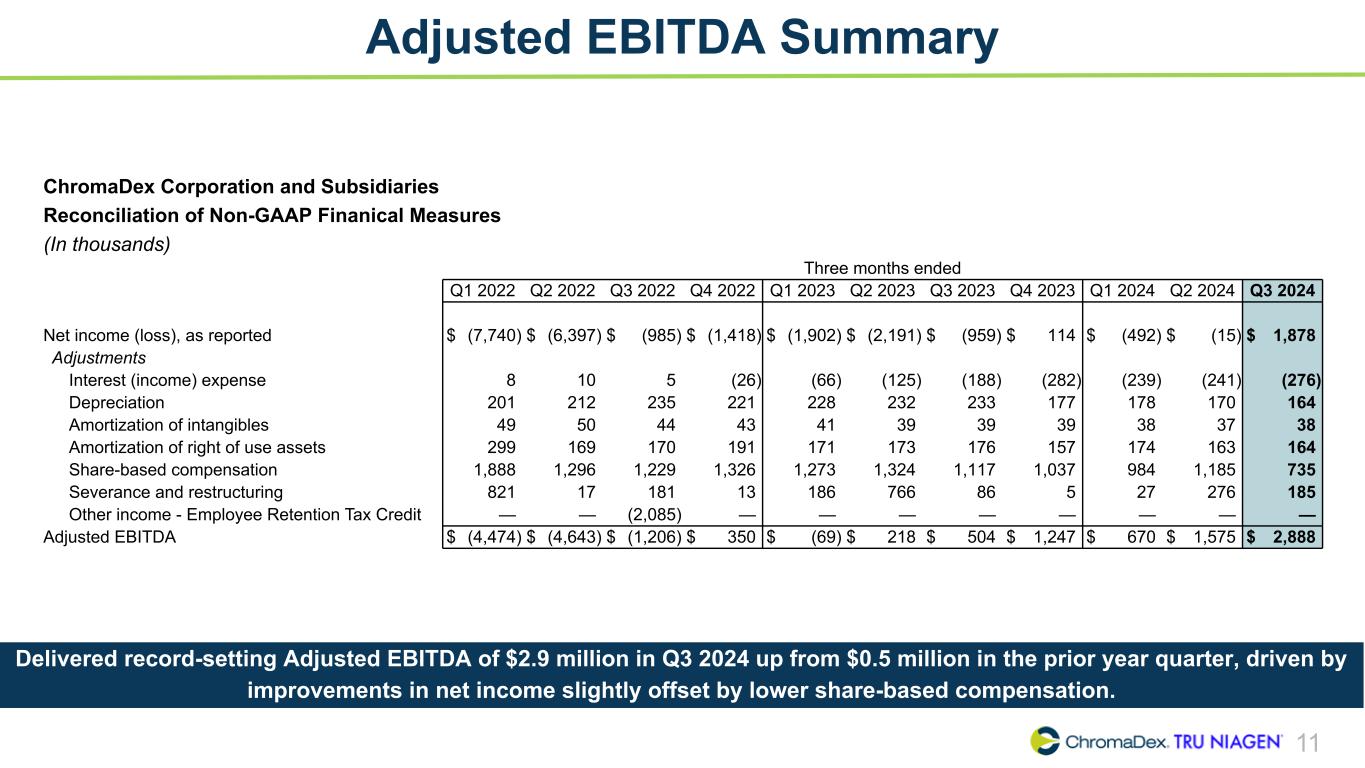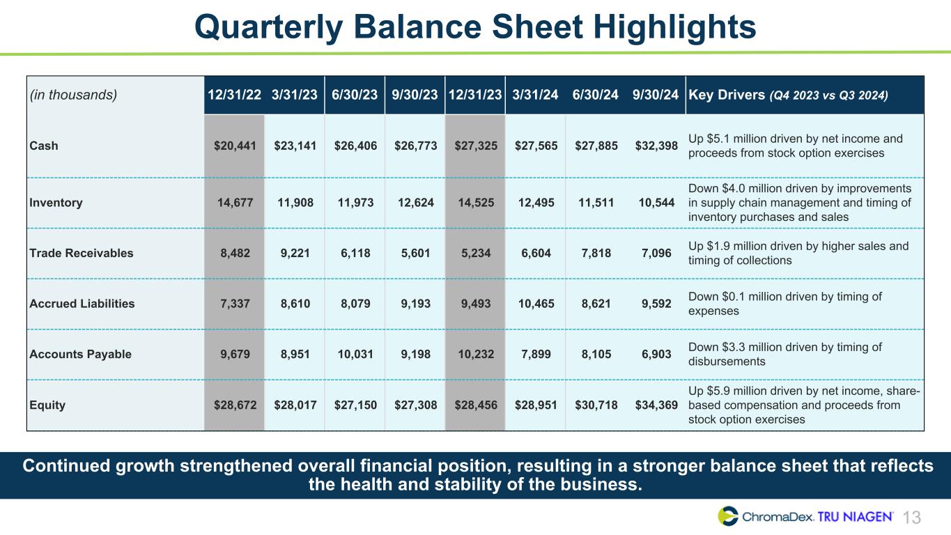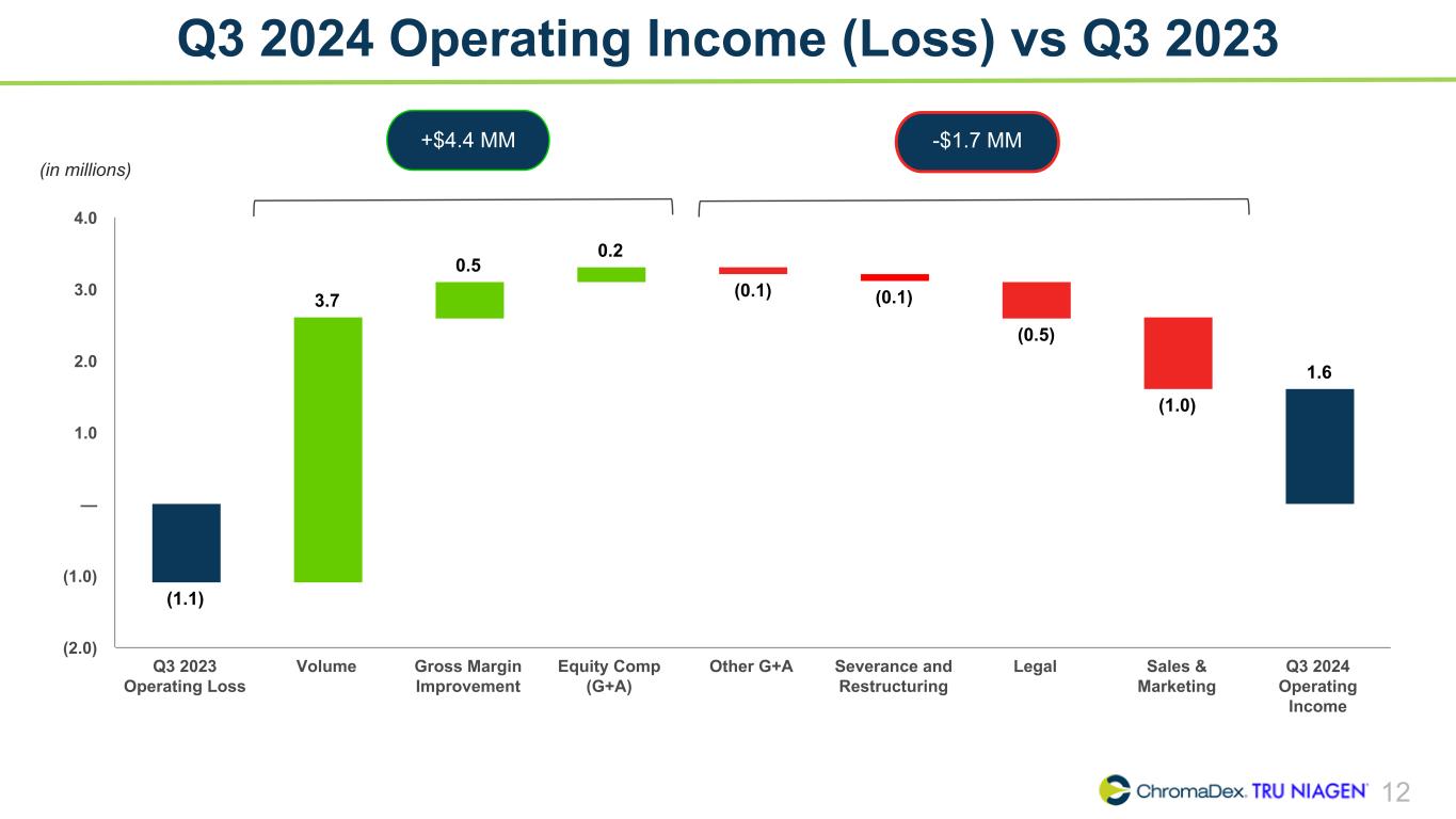 11 Adjusted EBITDA Summary Delivered record-setting Adjusted EBITDA of $2.9 million in Q3 2024 up from $0.5 million in the prior year quarter, driven by improvements in net income slightly offset by lower share-based compensation. ChromaDex Corporation and Subsidiaries Reconciliation of Non-GAAP Finanical Measures (In thousands) Three months ended Q1 2022 Q2 2022 Q3 2022 Q4 2022 Q1 2023 Q2 2023 Q3 2023 Q4 2023 Q1 2024 Q2 2024 Q3 2024 Net income (loss), as reported $ (7,740) $ (6,397) $ (985) $ (1,418) $ (1,902) $ (2,191) $ (959) $ 114 $ (492) $ (15) $ 1,878 Adjustments Interest (income) expense 8 10 5 (26) (66) (125) (188) (282) (239) (241) (276) Depreciation 201 212 235 221 228 232 233 177 178 170 164 Amortization of intangibles 49 50 44 43 41 39 39 39 38 37 38 Amortization of right of use assets 299 169 170 191 171 173 176 157 174 163 164 Share-based compensation 1,888 1,296 1,229 1,326 1,273 1,324 1,117 1,037 984 1,185 735 Severance and restructuring 821 17 181 13 186 766 86 5 27 276 185 Other income - Employee Retention Tax Credit — — (2,085) — — — — — — — — Adjusted EBITDA $ (4,474) $ (4,643) $ (1,206) $ 350 $ (69) $ 218 $ 504 $ 1,247 $ 670 $ 1,575 $ 2,888