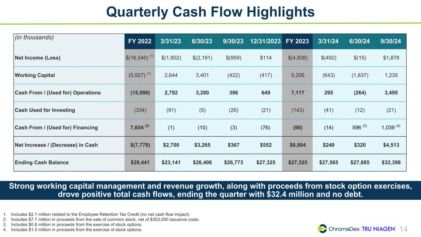 13 Quarterly Balance Sheet Highlights (in thousands) 12/31/22 3/31/23 6/30/23 9/30/23 12/31/23 3/31/24 6/30/24 9/30/24 Key Drivers (Q4 2023 vs Q3 2024) Cash $20,441 $23,141 $26,406 $26,773 $27,325 $27,565 $27,885 $32,398 Up $5.1 million driven by net income and proceeds from stock option exercises Inventory 14,677 11,908 11,973 12,624 14,525 12,495 11,511 10,544 Down $4.0 million driven by improvements in supply chain management and timing of inventory purchases and sales Trade Receivables 8,482 9,221 6,118 5,601 5,234 6,604 7,818 7,096 Up $1.9 million driven by higher sales and timing of collections Accrued Liabilities 7,337 8,610 8,079 9,193 9,493 10,465 8,621 9,592 Down $0.1 million driven by timing of expenses Accounts Payable 9,679 8,951 10,031 9,198 10,232 7,899 8,105 6,903 Down $3.3 million driven by timing of disbursements Equity $28,672 $28,017 $27,150 $27,308 $28,456 $28,951 $30,718 $34,369 Up $5.9 million driven by net income, share- based compensation and proceeds from stock option exercises Continued growth strengthened overall financial position, resulting in a stronger balance sheet that reflects the health and stability of the business.