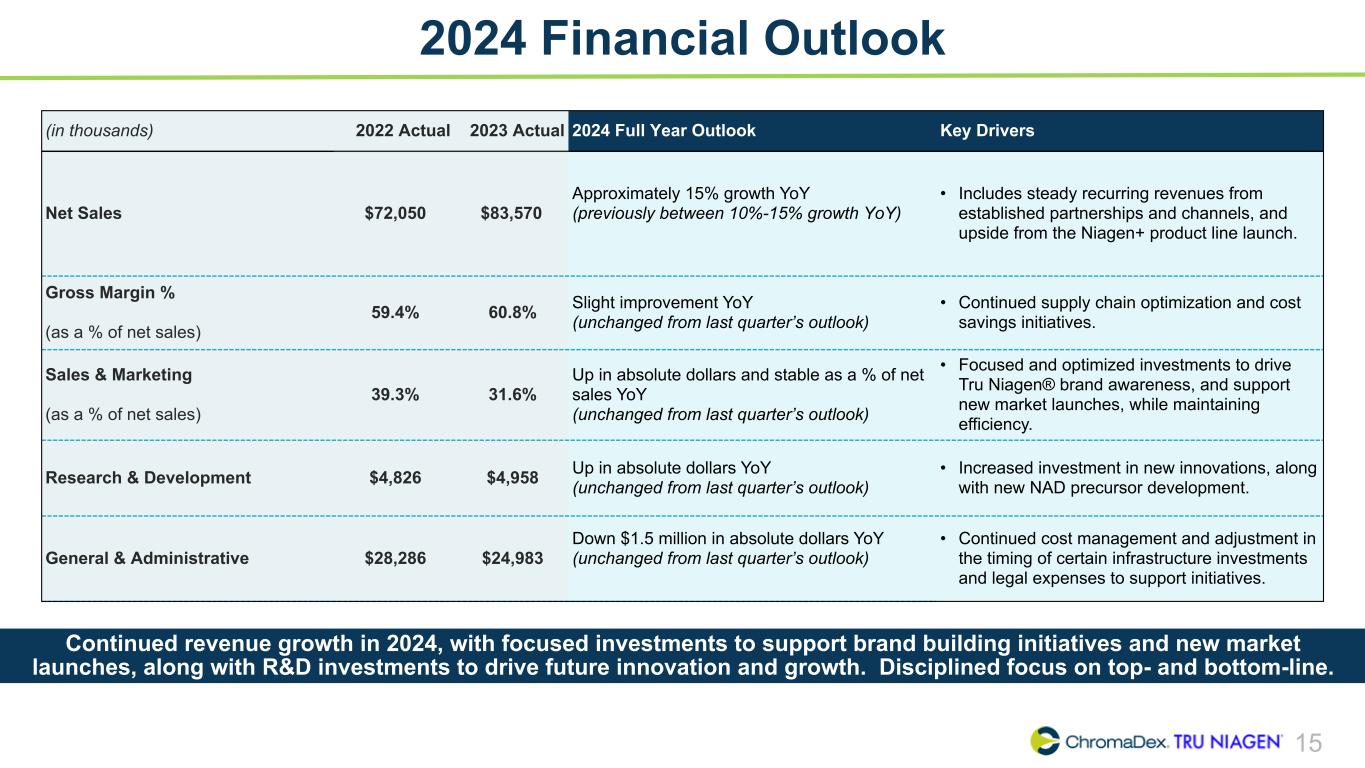 15 2024 Financial Outlook (in thousands) 2022 Actual 2023 Actual 2024 Full Year Outlook Key Drivers Net Sales $72,050 $83,570 Approximately 15% growth YoY (previously between 10%-15% growth YoY) • Includes steady recurring revenues from established partnerships and channels, and upside from the Niagen+ product line launch. Gross Margin % (as a % of net sales) 59.4% 60.8% Slight improvement YoY (unchanged from last quarter’s outlook) • Continued supply chain optimization and cost savings initiatives. Sales & Marketing (as a % of net sales) 39.3% 31.6% Up in absolute dollars and stable as a % of net sales YoY (unchanged from last quarter’s outlook) • Focused and optimized investments to drive Tru Niagen® brand awareness, and support new market launches, while maintaining efficiency. Research & Development $4,826 $4,958 Up in absolute dollars YoY (unchanged from last quarter’s outlook) • Increased investment in new innovations, along with new NAD precursor development. General & Administrative $28,286 $24,983 Down $1.5 million in absolute dollars YoY (unchanged from last quarter’s outlook) • Continued cost management and adjustment in the timing of certain infrastructure investments and legal expenses to support initiatives. Continued revenue growth in 2024, with focused investments to support brand building initiatives and new market launches, along with R&D investments to drive future innovation and growth. Disciplined focus on top- and bottom-line.