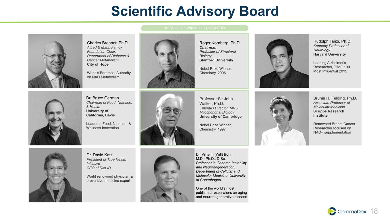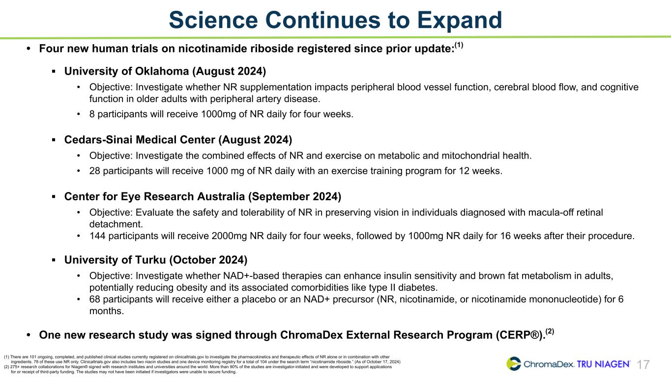 17 Science Continues to Expand (1) There are 101 ongoing, completed, and published clinical studies currently registered on clinicaltrials.gov to investigate the pharmacokinetics and therapeutic effects of NR alone or in combination with other ingredients. 78 of these use NR only. Clinicaltrials.gov also includes two niacin studies and one device monitoring registry for a total of 104 under the search term “nicotinamide riboside.” (As of October 17, 2024) (2) 275+ research collaborations for Niagen® signed with research institutes and universities around the world. More than 90% of the studies are investigator-initiated and were developed to support applications for or receipt of third-party funding. The studies may not have been initiated if investigators were unable to secure funding. • Four new human trials on nicotinamide riboside registered since prior update:(1) ▪ University of Oklahoma (August 2024) • Objective: Investigate whether NR supplementation impacts peripheral blood vessel function, cerebral blood flow, and cognitive function in older adults with peripheral artery disease. • 8 participants will receive 1000mg of NR daily for four weeks. ▪ Cedars-Sinai Medical Center (August 2024) • Objective: Investigate the combined effects of NR and exercise on metabolic and mitochondrial health. • 28 participants will receive 1000 mg of NR daily with an exercise training program for 12 weeks. ▪ Center for Eye Research Australia (September 2024) • Objective: Evaluate the safety and tolerability of NR in preserving vision in individuals diagnosed with macula-off retinal detachment. • 144 participants will receive 2000mg NR daily for four weeks, followed by 1000mg NR daily for 16 weeks after their procedure. ▪ University of Turku (October 2024) • Objective: Investigate whether NAD+-based therapies can enhance insulin sensitivity and brown fat metabolism in adults, potentially reducing obesity and its associated comorbidities like type II diabetes. • 68 participants will receive either a placebo or an NAD+ precursor (NR, nicotinamide, or nicotinamide mononucleotide) for 6 months. • One new research study was signed through ChromaDex External Research Program (CERP®).(2)