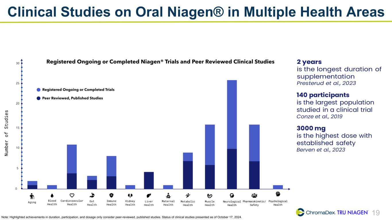 19 Clinical Studies on Oral Niagen® in Multiple Health Areas Note: Highlighted achievements in duration, participation, and dosage only consider peer-reviewed, published studies. Status of clinical studies presented as of October 17, 2024.