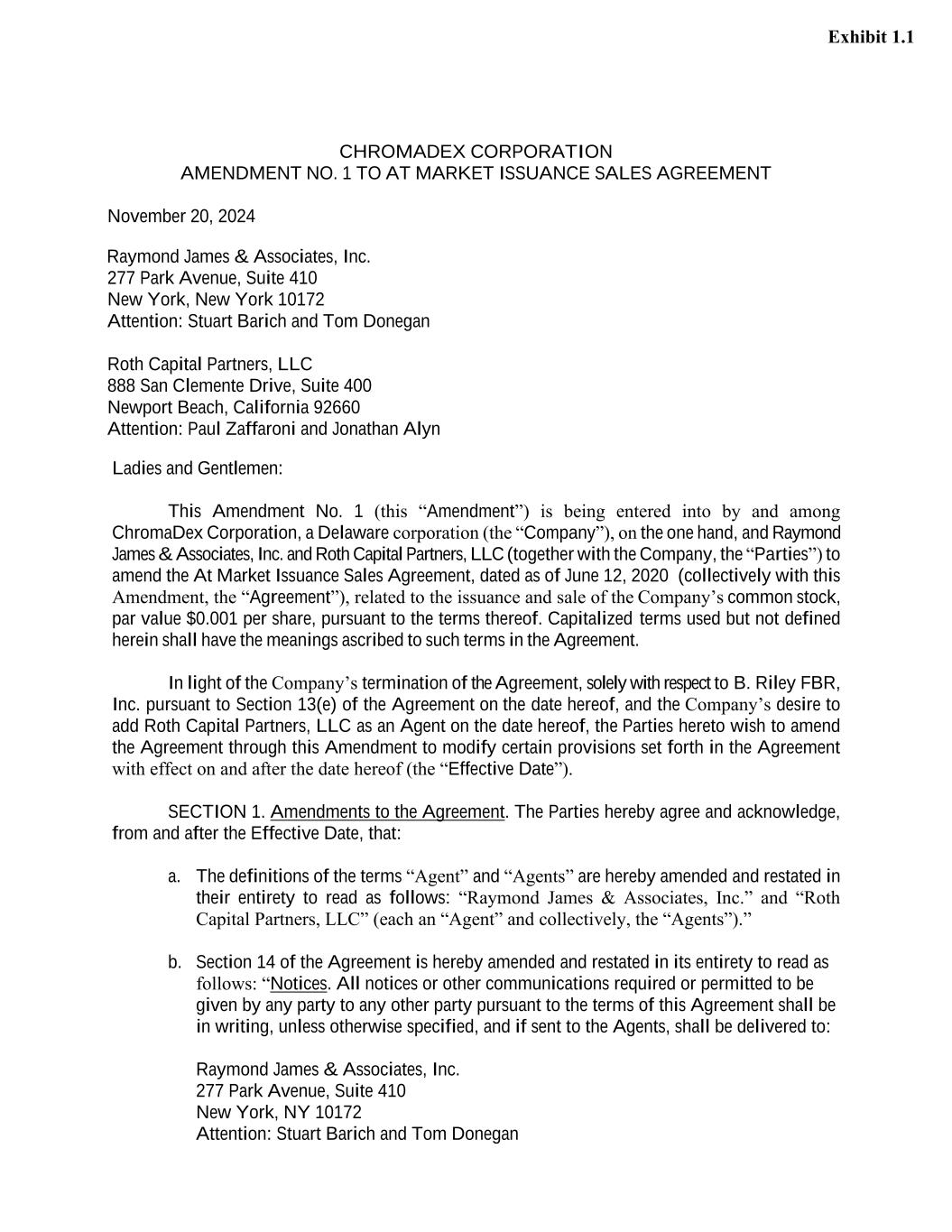 CHROMADEX CORPORATION AMENDMENT NO. 1 TO AT MARKET ISSUANCE SALES AGREEMENT November 20, 2024 Raymond James & Associates, Inc. 277 Park Avenue, Suite 410 New York, New York 10172 Attention: Stuart Barich and Tom Donegan Roth Capital Partners, LLC 888 San Clemente Drive, Suite 400 Newport Beach, California 92660 Attention: Paul Zaffaroni and Jonathan Alyn Ladies and Gentlemen: This Amendment No. 1 (this “Amendment”) is being entered into by and among ChromaDex Corporation, a Delaware corporation (the “Company”), on the one hand, and Raymond James & Associates, Inc. and Roth Capital Partners, LLC (together with the Company, the “Parties”) to amend the At Market Issuance Sales Agreement, dated as of June 12, 2020 (collectively with this Amendment, the “Agreement”), related to the issuance and sale of the Company’s common stock, par value $0.001 per share, pursuant to the terms thereof. Capitalized terms used but not defined herein shall have the meanings ascribed to such terms in the Agreement. In light of the Company’s termination of the Agreement, solely with respect to B. Riley FBR, Inc. pursuant to Section 13(e) of the Agreement on the date hereof, and the Company’s desire to add Roth Capital Partners, LLC as an Agent on the date hereof, the Parties hereto wish to amend the Agreement through this Amendment to modify certain provisions set forth in the Agreement with effect on and after the date hereof (the “Effective Date”). SECTION 1. Amendments to the Agreement. The Parties hereby agree and acknowledge, from and after the Effective Date, that: a. The definitions of the terms “Agent” and “Agents” are hereby amended and restated in their entirety to read as follows: “Raymond James & Associates, Inc.” and “Roth Capital Partners, LLC” (each an “Agent” and collectively, the “Agents”).” b. Section 14 of the Agreement is hereby amended and restated in its entirety to read as follows: “Notices. All notices or other communications required or permitted to be given by any party to any other party pursuant to the terms of this Agreement shall be in writing, unless otherwise specified, and if sent to the Agents, shall be delivered to: Raymond James & Associates, Inc. 277 Park Avenue, Suite 410 New York, NY 10172 Attention: Stuart Barich and Tom Donegan Exhibit 1.1