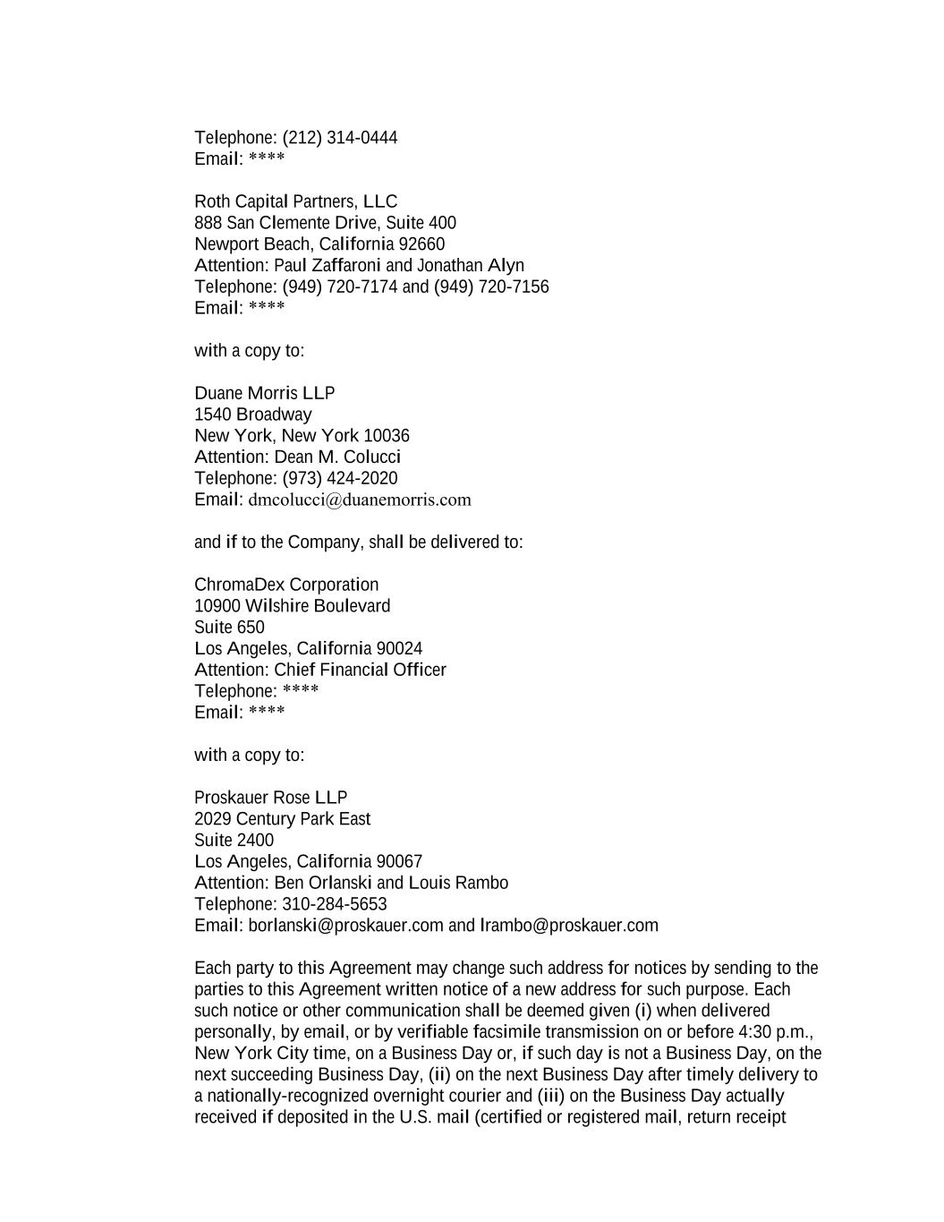 Telephone: (212) 314-0444 Email: **** Roth Capital Partners, LLC 888 San Clemente Drive, Suite 400 Newport Beach, California 92660 Attention: Paul Zaffaroni and Jonathan Alyn Telephone: (949) 720-7174 and (949) 720-7156 Email: **** with a copy to: Duane Morris LLP 1540 Broadway New York, New York 10036 Attention: Dean M. Colucci Telephone: (973) 424-2020 Email: dmcolucci@duanemorris.com and if to the Company, shall be delivered to: ChromaDex Corporation 10900 Wilshire Boulevard Suite 650 Los Angeles, California 90024 Attention: Chief Financial Officer Telephone: **** Email: **** with a copy to: Proskauer Rose LLP 2029 Century Park East Suite 2400 Los Angeles, California 90067 Attention: Ben Orlanski and Louis Rambo Telephone: 310-284-5653 Email: borlanski@proskauer.com and lrambo@proskauer.com Each party to this Agreement may change such address for notices by sending to the parties to this Agreement written notice of a new address for such purpose. Each such notice or other communication shall be deemed given (i) when delivered personally, by email, or by verifiable facsimile transmission on or before 4:30 p.m., New York City time, on a Business Day or, if such day is not a Business Day, on the next succeeding Business Day, (ii) on the next Business Day after timely delivery to a nationally-recognized overnight courier and (iii) on the Business Day actually received if deposited in the U.S. mail (certified or registered mail, return receipt