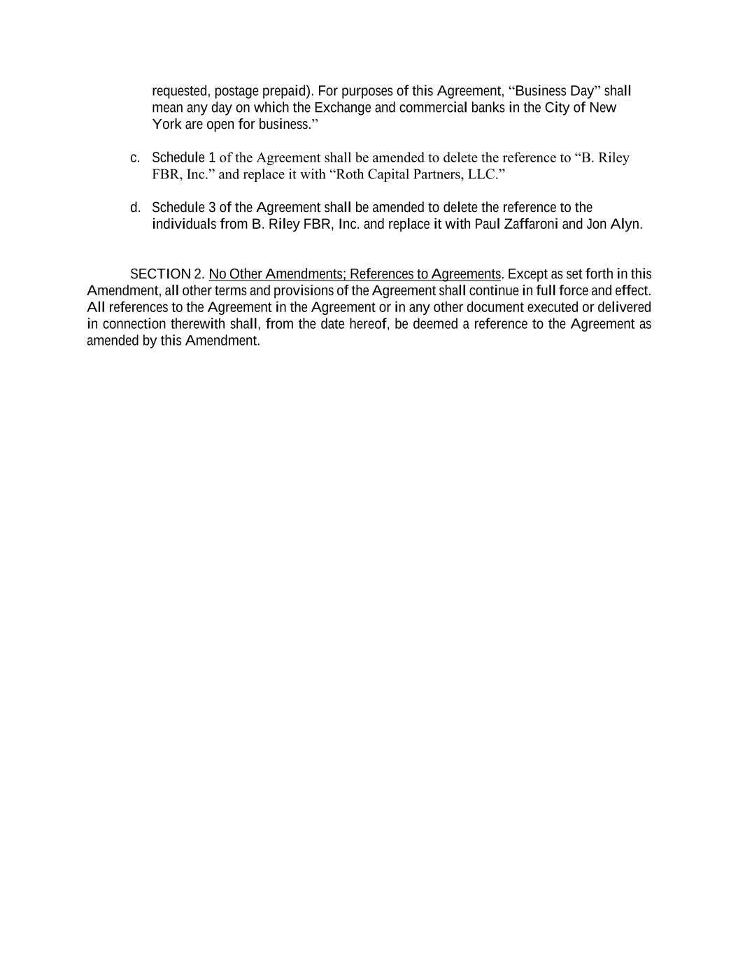 requested, postage prepaid). For purposes of this Agreement, “Business Day” shall mean any day on which the Exchange and commercial banks in the City of New York are open for business.” c. Schedule 1 of the Agreement shall be amended to delete the reference to “B. Riley FBR, Inc.” and replace it with “Roth Capital Partners, LLC.” d. Schedule 3 of the Agreement shall be amended to delete the reference to the individuals from B. Riley FBR, Inc. and replace it with Paul Zaffaroni and Jon Alyn. SECTION 2. No Other Amendments; References to Agreements. Except as set forth in this Amendment, all other terms and provisions of the Agreement shall continue in full force and effect. All references to the Agreement in the Agreement or in any other document executed or delivered in connection therewith shall, from the date hereof, be deemed a reference to the Agreement as amended by this Amendment.