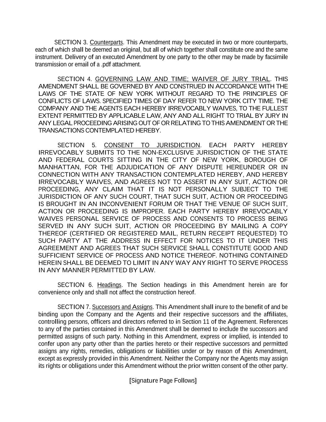SECTION 3. Counterparts. This Amendment may be executed in two or more counterparts, each of which shall be deemed an original, but all of which together shall constitute one and the same instrument. Delivery of an executed Amendment by one party to the other may be made by facsimile transmission or email of a .pdf attachment. SECTION 4. GOVERNING LAW AND TIME; WAIVER OF JURY TRIAL. THIS AMENDMENT SHALL BE GOVERNED BY AND CONSTRUED IN ACCORDANCE WITH THE LAWS OF THE STATE OF NEW YORK WITHOUT REGARD TO THE PRINCIPLES OF CONFLICTS OF LAWS. SPECIFIED TIMES OF DAY REFER TO NEW YORK CITY TIME. THE COMPANY AND THE AGENTS EACH HEREBY IRREVOCABLY WAIVES, TO THE FULLEST EXTENT PERMITTED BY APPLICABLE LAW, ANY AND ALL RIGHT TO TRIAL BY JURY IN ANY LEGAL PROCEEDING ARISING OUT OF OR RELATING TO THIS AMENDMENT OR THE TRANSACTIONS CONTEMPLATED HEREBY. SECTION 5. CONSENT TO JURISDICTION. EACH PARTY HEREBY IRREVOCABLY SUBMITS TO THE NON-EXCLUSIVE JURISDICTION OF THE STATE AND FEDERAL COURTS SITTING IN THE CITY OF NEW YORK, BOROUGH OF MANHATTAN, FOR THE ADJUDICATION OF ANY DISPUTE HEREUNDER OR IN CONNECTION WITH ANY TRANSACTION CONTEMPLATED HEREBY, AND HEREBY IRREVOCABLY WAIVES, AND AGREES NOT TO ASSERT IN ANY SUIT, ACTION OR PROCEEDING, ANY CLAIM THAT IT IS NOT PERSONALLY SUBJECT TO THE JURISDICTION OF ANY SUCH COURT, THAT SUCH SUIT, ACTION OR PROCEEDING IS BROUGHT IN AN INCONVENIENT FORUM OR THAT THE VENUE OF SUCH SUIT, ACTION OR PROCEEDING IS IMPROPER. EACH PARTY HEREBY IRREVOCABLY WAIVES PERSONAL SERVICE OF PROCESS AND CONSENTS TO PROCESS BEING SERVED IN ANY SUCH SUIT, ACTION OR PROCEEDING BY MAILING A COPY THEREOF (CERTIFIED OR REGISTERED MAIL, RETURN RECEIPT REQUESTED) TO SUCH PARTY AT THE ADDRESS IN EFFECT FOR NOTICES TO IT UNDER THIS AGREEMENT AND AGREES THAT SUCH SERVICE SHALL CONSTITUTE GOOD AND SUFFICIENT SERVICE OF PROCESS AND NOTICE THEREOF. NOTHING CONTAINED HEREIN SHALL BE DEEMED TO LIMIT IN ANY WAY ANY RIGHT TO SERVE PROCESS IN ANY MANNER PERMITTED BY LAW. SECTION 6. Headings. The Section headings in this Amendment herein are for convenience only and shall not affect the construction hereof. SECTION 7. Successors and Assigns. This Amendment shall inure to the benefit of and be binding upon the Company and the Agents and their respective successors and the affiliates, controlling persons, officers and directors referred to in Section 11 of the Agreement. References to any of the parties contained in this Amendment shall be deemed to include the successors and permitted assigns of such party. Nothing in this Amendment, express or implied, is intended to confer upon any party other than the parties hereto or their respective successors and permitted assigns any rights, remedies, obligations or liabilities under or by reason of this Amendment, except as expressly provided in this Amendment. Neither the Company nor the Agents may assign its rights or obligations under this Amendment without the prior written consent of the other party. [Signature Page Follows]