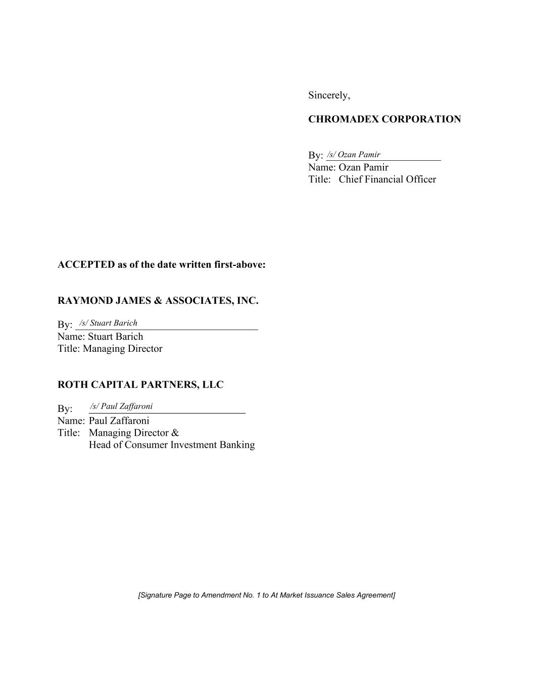 Sincerely, CHROMADEX CORPORATION By: ______________________ Name: Ozan Pamir Title: Chief Financial Officer ACCEPTED as of the date written first-above: RAYMOND JAMES & ASSOCIATES, INC. By: ___________________________________ Name: Stuart Barich Title: Managing Director ROTH CAPITAL PARTNERS, LLC By: Name: Paul Zaffaroni Title: Managing Director & Head of Consumer Investment Banking [Signature Page to Amendment No. 1 to At Market Issuance Sales Agreement] /s/ Ozan Pamir /s/ Stuart Barich /s/ Paul Zaffaroni