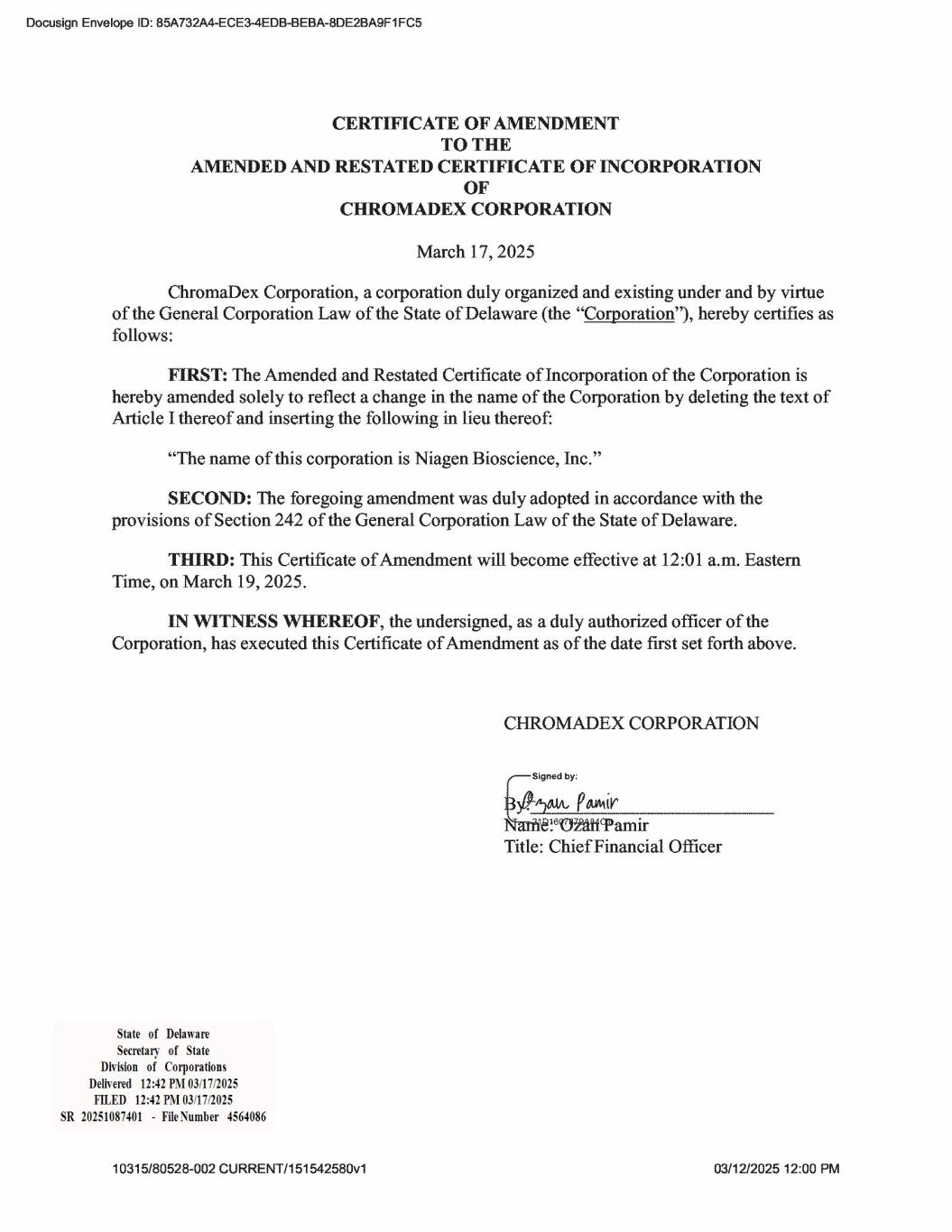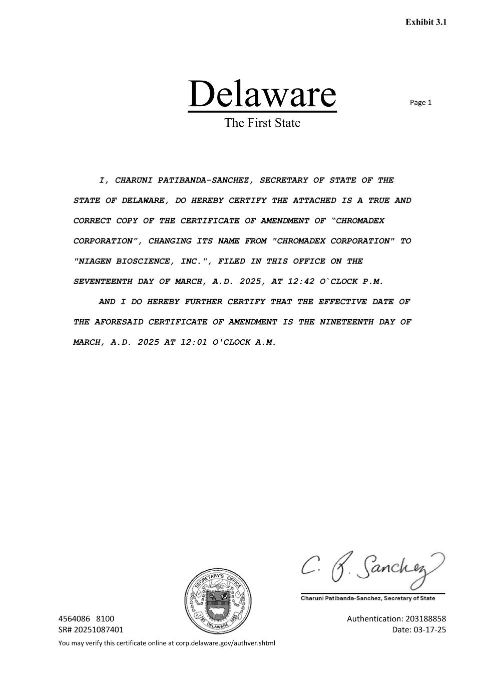 Delaware The First State Page 1 4564086 8100 Authentication: 203188858 SR# 20251087401 Date: 03-17-25 You may verify this certificate online at corp.delaware.gov/authver.shtml I, CHARUNI PATIBANDA-SANCHEZ, SECRETARY OF STATE OF THE STATE OF DELAWARE, DO HEREBY CERTIFY THE ATTACHED IS A TRUE AND CORRECT COPY OF THE CERTIFICATE OF AMENDMENT OF “CHROMADEX CORPORATION”, CHANGING ITS NAME FROM "CHROMADEX CORPORATION" TO "NIAGEN BIOSCIENCE, INC.", FILED IN THIS OFFICE ON THE SEVENTEENTH DAY OF MARCH, A.D. 2025, AT 12:42 O`CLOCK P.M. AND I DO HEREBY FURTHER CERTIFY THAT THE EFFECTIVE DATE OF THE AFORESAID CERTIFICATE OF AMENDMENT IS THE NINETEENTH DAY OF MARCH, A.D. 2025 AT 12:01 O'CLOCK A.M. Exhibit 3.1