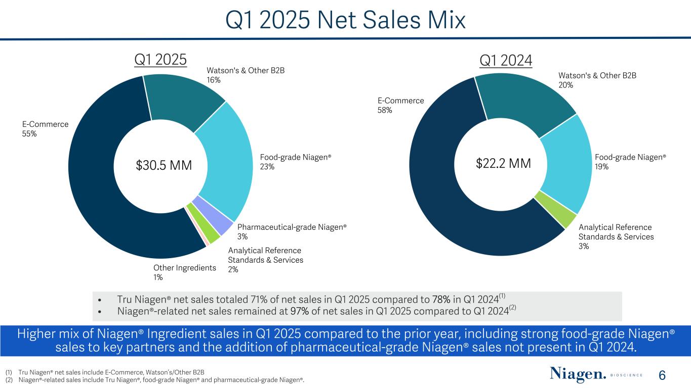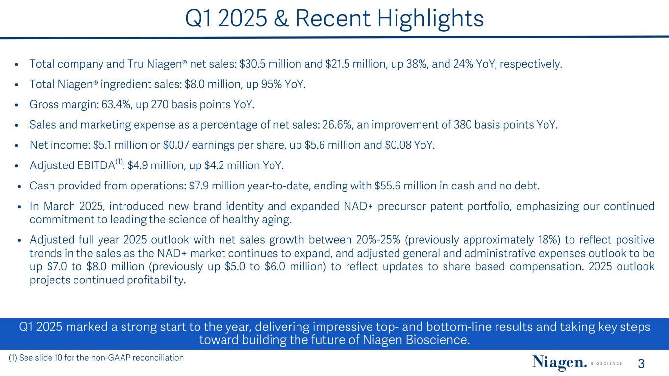 SAFE HARBOR STATEMENT 2 This presentation and other written or oral statements made from time to time by representatives of Niagen Bioscience contain “forward-looking statements” within the meaning of Section 27A of the Securities Act of 1933, as amended, and Section 21E of the Securities Exchange Act of 1934, as amended. Forward-looking statements reflect the current view about future events. Statements that are not historical in nature, such as 2025 financial outlook, and which may be identified by the use of words like “expects,” “anticipates,” “intends,” “estimates,” “plans,” “potential,” “possible,” “probable,” “believes,” “seeks,” “may,” “will,” “should,” “could,” “predicts,” “projects,” “continue,” “would” or the negative of these terms and other words of similar meaning, are forward-looking statements. Such statements include, but are not limited to, statements contained in this presentation relating to our expected sales, cash flows, planned investments, and financial performance, business, business strategy, expansion, growth, key drivers (including cost savings and increased investments), products and services we offer and their impact on our performance or products and services we may offer in the future and the timing of their development, sales and marketing strategy and capital outlook. Forward-looking statements are based on management’s current expectations and assumptions regarding our business, the economy and other future conditions and are subject to inherent risks, uncertainties and changes of circumstances that are difficult to predict and may cause actual results to differ materially from those contemplated or expressed. We caution you therefore against relying on any of these forward-looking statements. These risks and uncertainties include those risk factors discussed in Part I, “Item 1A. Risk Factors” of our most recent Annual Report on Form 10-K and Quarterly Report on Form 10-Q filed with the Securities Exchange Commission (the “Commission”), and in subsequent filings with the Commission. Any forward-looking statements are qualified in their entirety by reference to the factors discussed in these filings with the Commission. Should one or more of these risks or uncertainties materialize, or should the underlying assumptions prove incorrect, actual results may differ significantly from those anticipated, believed, estimated, expected, intended or planned. Important factors that could cause actual results to differ materially from those in the forward looking statements include but are not limited to: inflationary conditions and adverse economic conditions; our history of operating losses and need to obtain additional financing; the growth and profitability of our product sales; our ability to maintain and grow sales, marketing and distribution capabilities; changing consumer perceptions of our products; our reliance on a single or limited number of third-party suppliers; risks of conducting business in China; including unanticipated developments in and risks related to the Company’s ability to secure adequate quantities of pharmaceutical-grade Niagen in a timely manner; the Company’s ability to obtain appropriate contracts and arrangements with U.S. FDA-registered 503B outsourcing facilities required to compound and distribute pharmaceutical-grade Niagen to clinics; the Company’s ability to remain on the U.S. FDA Bulk Drug Substances Nominated for Use in Compounding Under Section 503B of the Federal Food, Drug, and Cosmetic Act Category 1 list; the Company’s ability to maintain and enforce the Company’s existing intellectual property and obtain new patents; whether the potential benefits of NRC can be further supported; further research and development and the results of clinical trials possibly being unsuccessful or insufficient to meet applicable regulatory standards or warrant continued development; the ability to enroll sufficient numbers of subjects in clinical trials; determinations made by the FDA and other governmental authorities; and the risks and uncertainties associated with our business and financial condition in general. Factors or events that could cause our actual results to differ may emerge from time to time, and it is not possible for us to predict all of them. We cannot guarantee future results, levels of activity, performance or achievements. Except as required by applicable law, including the securities laws of the United States, we do not intend to update any of the forward-looking statements to conform these statements to actual results.  About Non-GAAP Financial Measures Niagen Bioscience’s non-GAAP financial measure, Adjusted EBITDA, is defined as net income before interest, provision for income taxes, depreciation, amortization, non-cash share-based compensation costs, severance and restructuring expense and other infrequent items, including the reversal of previously accrued royalties and license maintenance fees, and the recovery of previously recognized credit losses from a legal settlement. Niagen Bioscience used this non-GAAP measures when evaluating its financial results as well as for internal resource management, planning and forecasting purposes. This non-GAAP measure should not be viewed in isolation from or as a substitute for Niagen Bioscience’s financial results in accordance with GAAP. Reconciliation of this non-GAAP measure to the most directly comparable GAAP measure is attached to this presentation. FDA Disclaimer Statements made in this presentation have not been evaluated by the Food and Drug Administration. Niagen Bioscience products are not intended to diagnose, treat, cure, or prevent any disease. The statements in this presentation are for investor relations and educational purposes only and not intended for consumers or vendors.