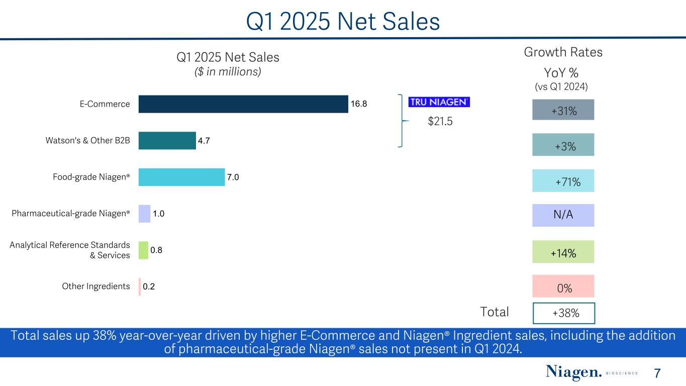 Q1 2025 Net Sales Mix E-Commerce 58% Watson's & Other B2B 20% Food-grade Niagen® 19% Analytical Reference Standards & Services 3% Q1 2024 $22.2 MM E-Commerce 55% Watson's & Other B2B 16% Food-grade Niagen® 23% Pharmaceutical-grade Niagen® 3% Analytical Reference Standards & Services 2%Other Ingredients 1% $30.5 MM Q1 2025 • Tru Niagen® net sales totaled 71% of net sales in Q1 2025 compared to 78% in Q1 2024(1) • Niagen®-related net sales remained at 97% of net sales in Q1 2025 compared to Q1 2024(2) Higher mix of Niagen® Ingredient sales in Q1 2025 compared to the prior year, including strong food-grade Niagen® sales to key partners and the addition of pharmaceutical-grade Niagen® sales not present in Q1 2024. (1) Tru Niagen® net sales include E-Commerce, Watson’s/Other B2B (2) Niagen®-related sales include Tru Niagen®, food-grade Niagen® and pharmaceutical-grade Niagen®. 6