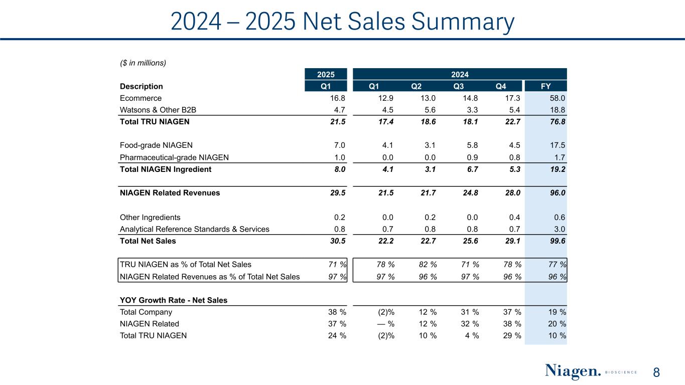 N/A Q1 2025 Net Sales Q1 2025 Net Sales ($ in millions) 16.8 4.7 7.0 1.0 0.8 0.2 E-Commerce Watson's & Other B2B Food-grade Niagen® Pharmaceutical-grade Niagen® Analytical Reference Standards & Services Other Ingredients $21.5 YoY % (vs Q1 2024) +31% +3% +71% +14% +38%Total Growth Rates Total sales up 38% year-over-year driven by higher E-Commerce and Niagen® Ingredient sales, including the addition of pharmaceutical-grade Niagen® sales not present in Q1 2024. 7 0%