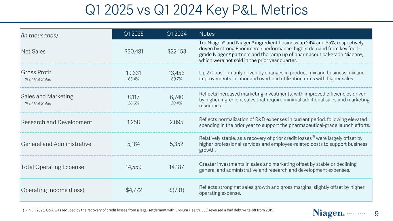 Q1 2025 vs Q1 2024 Key P&L Metrics (in thousands) Q1 2025 Q1 2024 Notes Net Sales $30,481 $22,153 Tru Niagen® and Niagen® ingredient business up 24% and 95%, respectively, driven by strong Ecommerce performance, higher demand from key food- grade Niagen® partners and the ramp up of pharmaceutical-grade Niagen®, which were not sold in the prior year quarter. Gross Profit % of Net Sales 19,331 63.4% 13,456 60.7% Up 270bps primarily driven by changes in product mix and business mix and improvements in labor and overhead utilization rates with higher sales. Sales and Marketing % of Net Sales 8,117 26.6% 6,740 30.4% Reflects increased marketing investments, with improved efficiencies driven by higher ingredient sales that require minimal additional sales and marketing resources. Research and Development 1,258 2,095 Reflects normalization of R&D expenses in current period, following elevated spending in the prior year to support the pharmaceutical-grade launch efforts. General and Administrative 5,184 5,352 Relatively stable, as a recovery of prior credit losses(1) were largely offset by higher professional services and employee-related costs to support business growth. Total Operating Expense 14,559 14,187 Greater investments in sales and marketing offset by stable or declining general and administrative and research and development expenses. Operating Income (Loss) $4,772 $(731) Reflects strong net sales growth and gross margins, slightly offset by higher operating expense. 9 (1) In Q1 2025, G&A was reduced by the recovery of credit losses from a legal settlement with Elysium Health, LLC reversed a bad debt write-off from 2019.