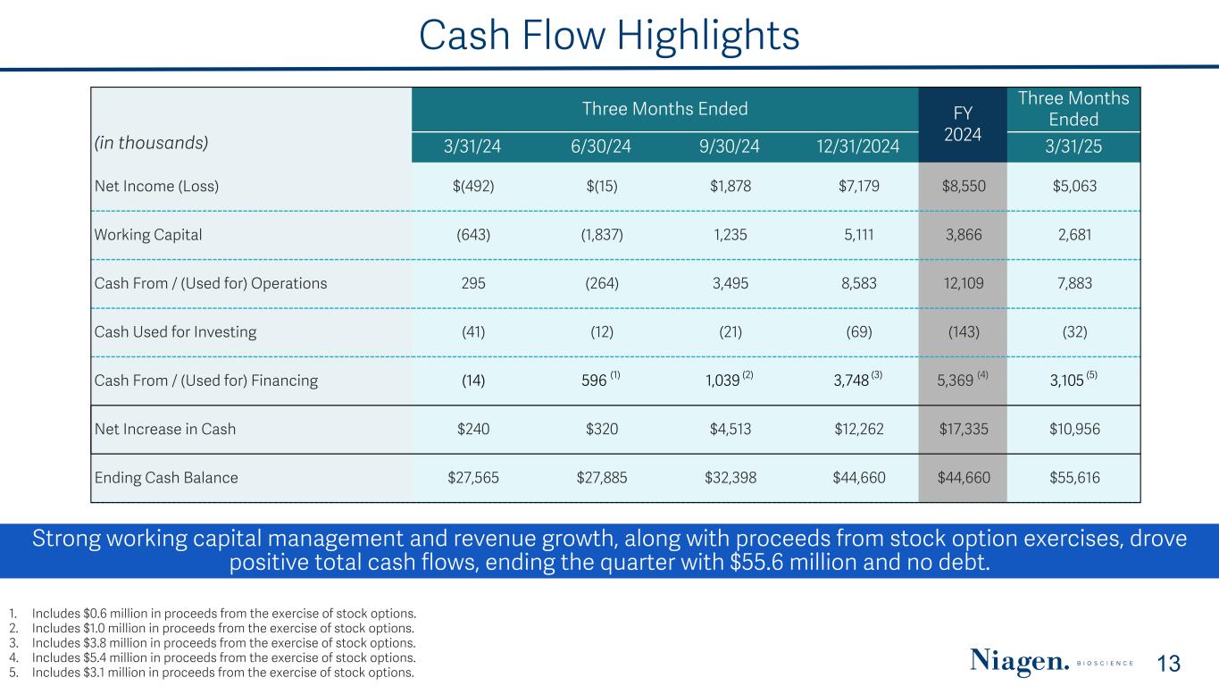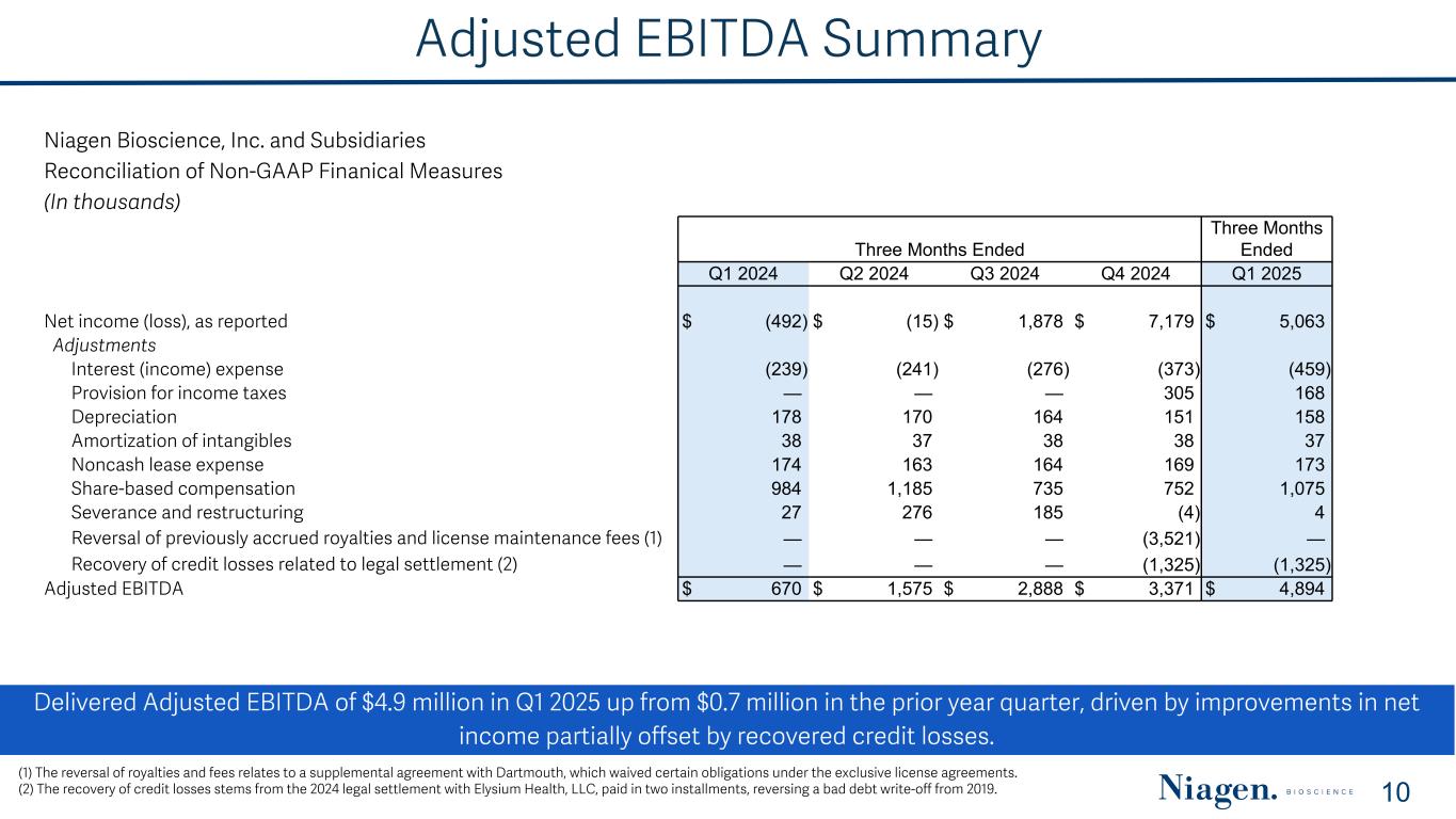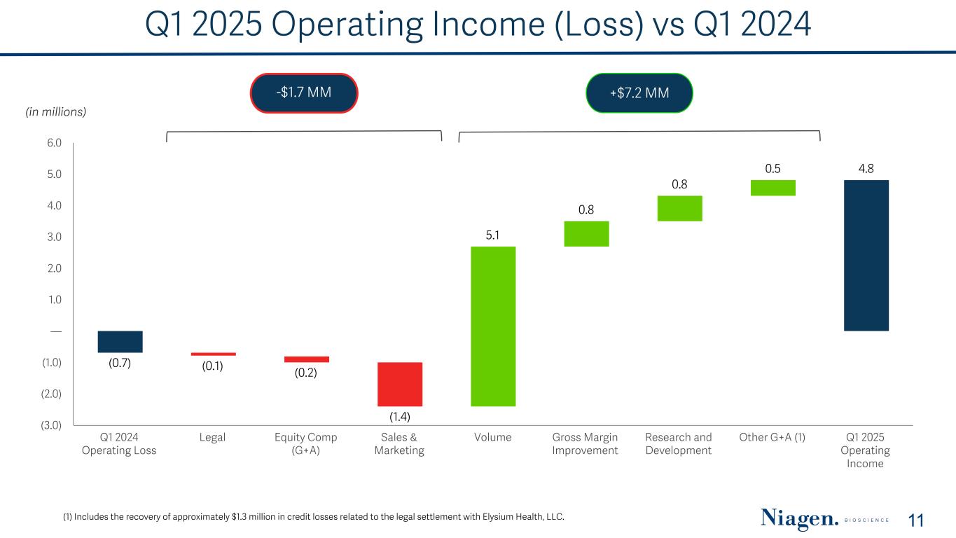 Adjusted EBITDA Summary Delivered Adjusted EBITDA of $4.9 million in Q1 2025 up from $0.7 million in the prior year quarter, driven by improvements in net income partially offset by recovered credit losses. 10 (1) The reversal of royalties and fees relates to a supplemental agreement with Dartmouth, which waived certain obligations under the exclusive license agreements. (2) The recovery of credit losses stems from the 2024 legal settlement with Elysium Health, LLC, paid in two installments, reversing a bad debt write-off from 2019. Niagen Bioscience, Inc. and Subsidiaries Reconciliation of Non-GAAP Finanical Measures (In thousands) Three Months Ended Three Months Ended Q1 2024 Q2 2024 Q3 2024 Q4 2024 Q1 2025 Net income (loss), as reported $ (492) $ (15) $ 1,878 $ 7,179 $ 5,063 Adjustments Interest (income) expense (239) (241) (276) (373) (459) Provision for income taxes — — — 305 168 Depreciation 178 170 164 151 158 Amortization of intangibles 38 37 38 38 37 Noncash lease expense 174 163 164 169 173 Share-based compensation 984 1,185 735 752 1,075 Severance and restructuring 27 276 185 (4) 4 Reversal of previously accrued royalties and license maintenance fees (1) — — — (3,521) — Recovery of credit losses related to legal settlement (2) — — — (1,325) (1,325) Adjusted EBITDA $ 670 $ 1,575 $ 2,888 $ 3,371 $ 4,894