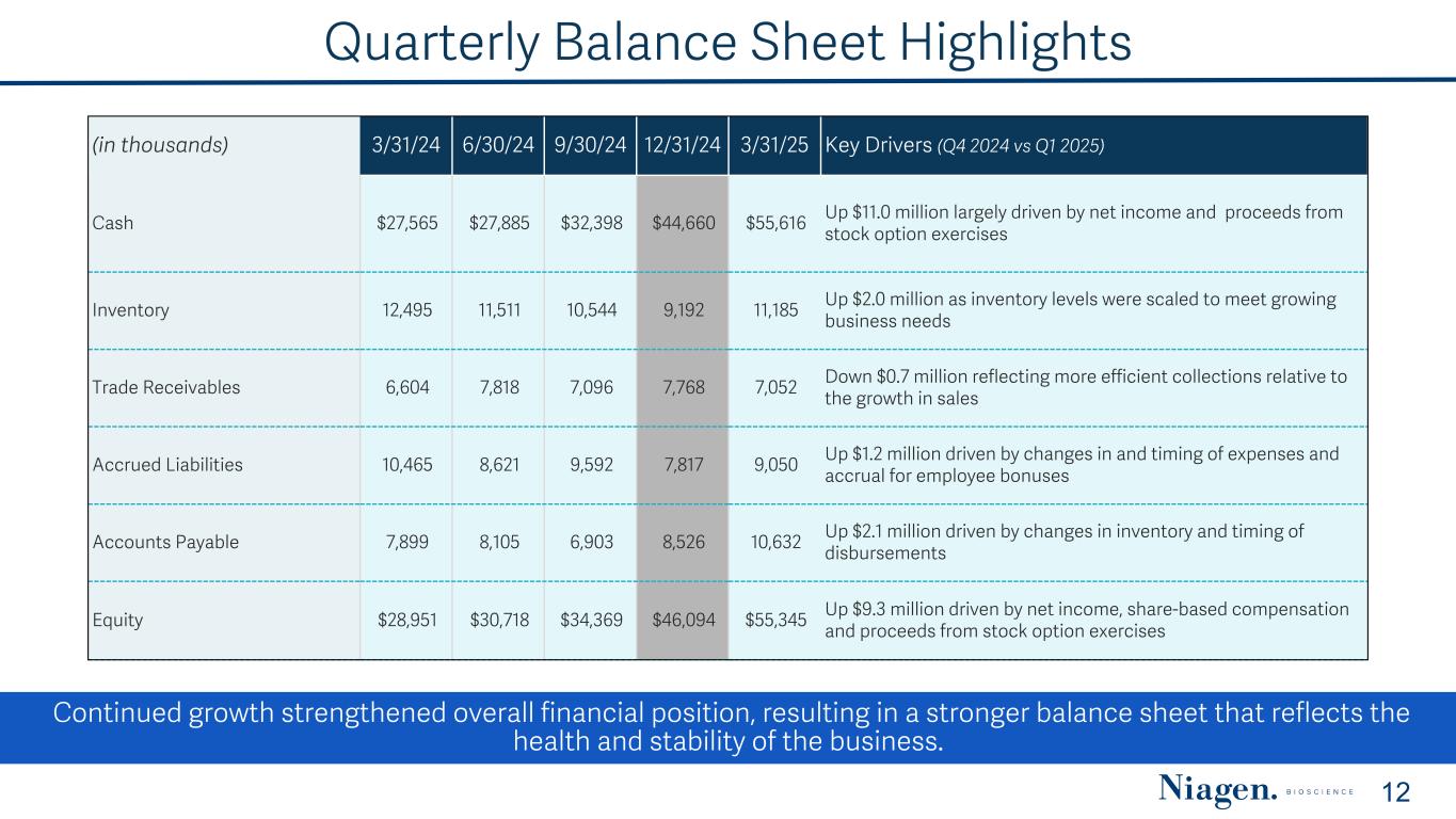 Quarterly Balance Sheet Highlights (in thousands) 3/31/24 6/30/24 9/30/24 12/31/24 3/31/25 Key Drivers (Q4 2024 vs Q1 2025) Cash $27,565 $27,885 $32,398 $44,660 $55,616 Up $11.0 million largely driven by net income and proceeds from stock option exercises Inventory 12,495 11,511 10,544 9,192 11,185 Up $2.0 million as inventory levels were scaled to meet growing business needs Trade Receivables 6,604 7,818 7,096 7,768 7,052 Down $0.7 million reflecting more efficient collections relative to the growth in sales Accrued Liabilities 10,465 8,621 9,592 7,817 9,050 Up $1.2 million driven by changes in and timing of expenses and accrual for employee bonuses Accounts Payable 7,899 8,105 6,903 8,526 10,632 Up $2.1 million driven by changes in inventory and timing of disbursements Equity $28,951 $30,718 $34,369 $46,094 $55,345 Up $9.3 million driven by net income, share-based compensation and proceeds from stock option exercises Continued growth strengthened overall financial position, resulting in a stronger balance sheet that reflects the health and stability of the business. 12