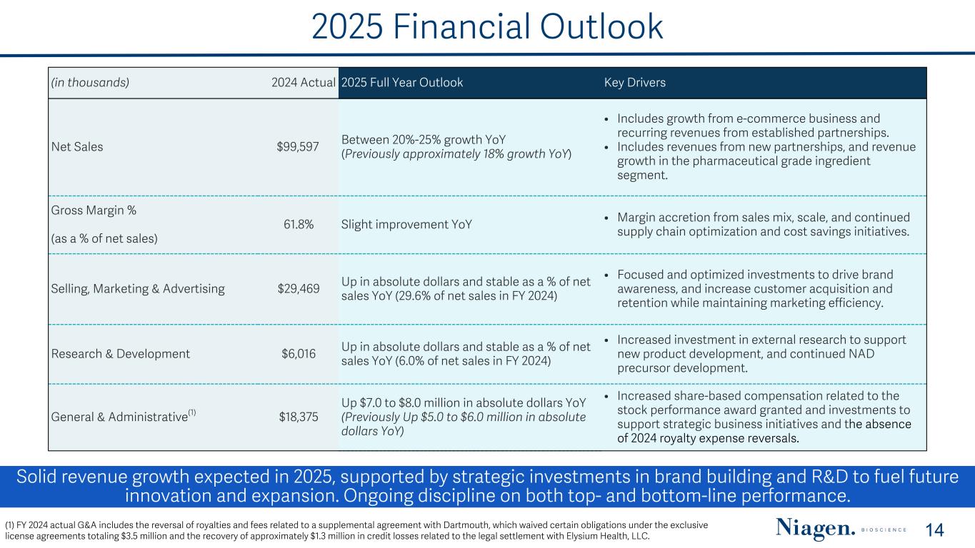 2025 Financial Outlook (in thousands) 2024 Actual 2025 Full Year Outlook Key Drivers Net Sales $99,597 Between 20%-25% growth YoY (Previously approximately 18% growth YoY) • Includes growth from e-commerce business and recurring revenues from established partnerships. • Includes revenues from new partnerships, and revenue growth in the pharmaceutical grade ingredient segment. Gross Margin % (as a % of net sales) 61.8% Slight improvement YoY • Margin accretion from sales mix, scale, and continued supply chain optimization and cost savings initiatives. Selling, Marketing & Advertising $29,469 Up in absolute dollars and stable as a % of net sales YoY (29.6% of net sales in FY 2024) • Focused and optimized investments to drive brand awareness, and increase customer acquisition and retention while maintaining marketing efficiency. Research & Development $6,016 Up in absolute dollars and stable as a % of net sales YoY (6.0% of net sales in FY 2024) • Increased investment in external research to support new product development, and continued NAD precursor development. General & Administrative(1) $18,375 Up $7.0 to $8.0 million in absolute dollars YoY (Previously Up $5.0 to $6.0 million in absolute dollars YoY) • Increased share-based compensation related to the stock performance award granted and investments to support strategic business initiatives and the absence of 2024 royalty expense reversals. Solid revenue growth expected in 2025, supported by strategic investments in brand building and R&D to fuel future innovation and expansion. Ongoing discipline on both top- and bottom-line performance. 14(1) FY 2024 actual G&A includes the reversal of royalties and fees related to a supplemental agreement with Dartmouth, which waived certain obligations under the exclusive license agreements totaling $3.5 million and the recovery of approximately $1.3 million in credit losses related to the legal settlement with Elysium Health, LLC.
