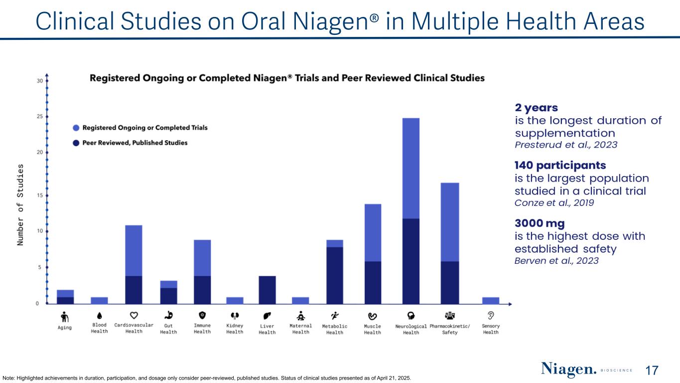 Clinical Studies on Oral Niagen® in Multiple Health Areas Note: Highlighted achievements in duration, participation, and dosage only consider peer-reviewed, published studies. Status of clinical studies presented as of April 21, 2025. 17