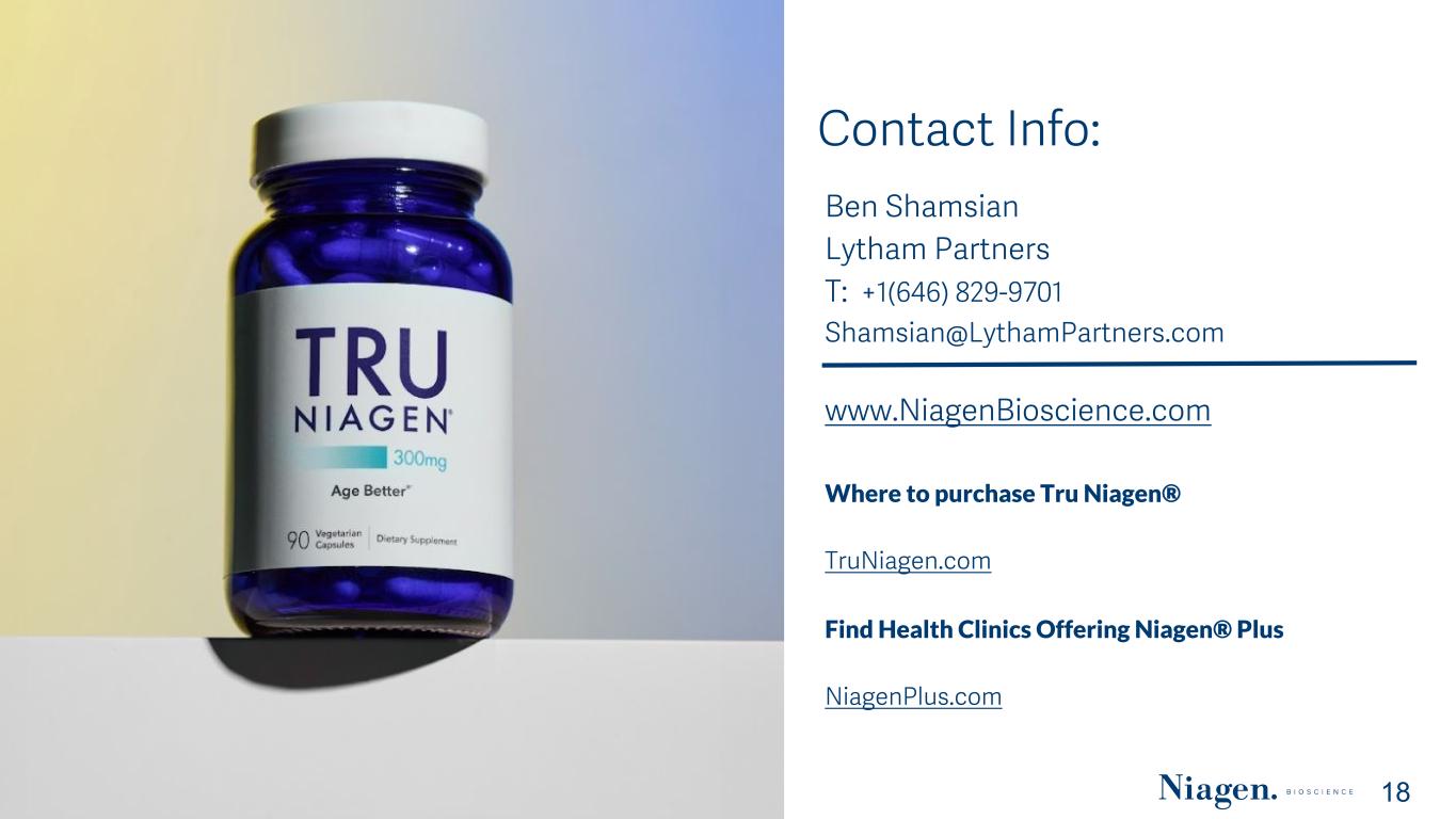 The information contained in this documents is confidential, privileged and only for the information of the intended recipient and may not be used, published or redistributed without the prior written consent (2019) Contact Info: Ben Shamsian Lytham Partners T: +1(646) 829-9701 Shamsian@LythamPartners.com www.NiagenBioscience.com Where to purchase Tru Niagen® TruNiagen.com Find Health Clinics Offering Niagen® Plus NiagenPlus.com 18
