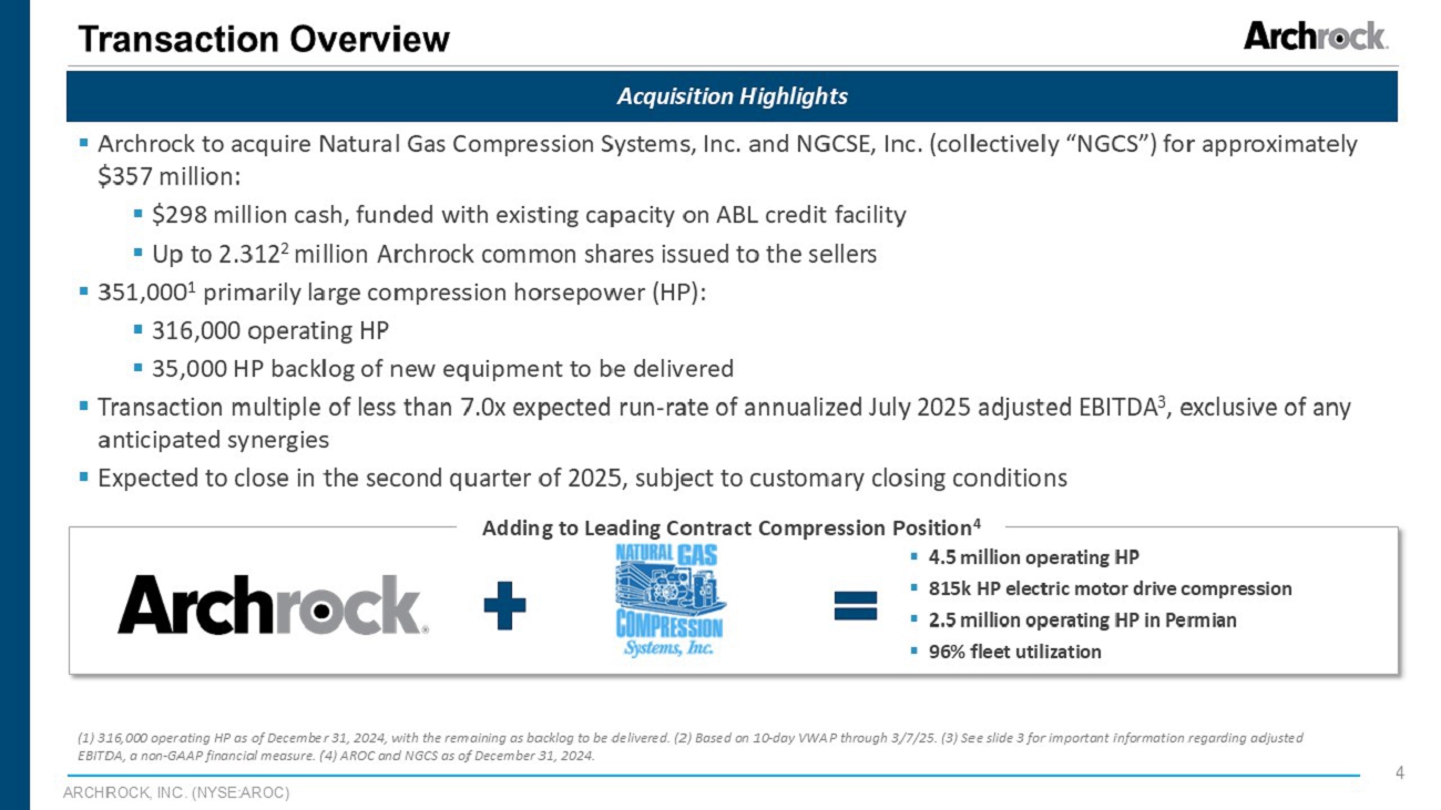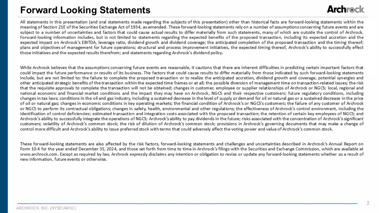 ARCHROCK, INC. (NYSE:AROC) 2 Forward Looking Statements All statements in this presentation (and oral statements made regarding the subjects of this presentation) other than historical facts are forward - looking statements within the meaning of Section 21 E of the Securities Exchange Act of 1934 , as amended . These forward - looking statements rely on a number of assumptions concerning future events and are subject to a number of uncertainties and factors that could cause actual results to differ materially from such statements, many of which are outside the control of Archrock . Forward - looking information includes, but is not limited to statements regarding the expected benefits of the proposed transaction, including its expected accretion and the expected impact on Archrock’s EBITDA, leverage ratio, dividend growth and dividend coverage ; the anticipated completion of the proposed transaction and the timing thereof ; plans and objectives of management for future operations ; structural and process improvement initiatives, the expected timing thereof, Archrock’s ability to successfully effect those initiatives and the expected results therefrom ; and statements regarding Archrock’s dividend policy . While Archrock believes that the assumptions concerning future events are reasonable, it cautions that there are inherent difficulties in predicting certain important factors that could impact the future performance or results of its business . The factors that could cause results to differ materially from those indicated by such forward - looking statements include, but are not limited to : the failure to complete the proposed transaction or to realize the anticipated accretion, dividend growth and coverage, potential synergies and other anticipated strategic benefits of the transaction within the expected time frames or at all ; the possible diversion of management time on transaction - related issues ; the risk that the requisite approvals to complete the transaction will not be obtained ; changes in customer, employee or supplier relationships of Archrock or NGCS ; local, regional and national economic and financial market conditions and the impact they may have on Archrock, NGCS and their respective customers ; future regulatory conditions, including changes in tax laws ; conditions in the oil and gas industry, including a sustained decrease in the level of supply or demand for oil or natural gas or a sustained decrease in the price of oil or natural gas ; changes in economic conditions in key operating markets ; the financial condition of Archrock’s or NGCS’s customers ; the failure of any customer of Archrock or NGCS to perform its contractual obligations ; changes in safety, health, environmental and other regulations ; the effectiveness of Archrock’s control environment, including the identification of control deficiencies ; estimated transaction and integration costs associated with the proposed transaction ; the retention of certain key employees of NGCS ; and Archrock’s ability to successfully integrate the operations of NGCS ; Archrock’s ability to pay dividends in the future ; risks associated with the concentration of Archrock’s significant customers ; volatility of Archrock’s common stock ; the risk of dilution of Archrock’s common stock ; provisions in Archrock’s governing documents that may make a change of control more difficult and Archrock’s ability to issue preferred stock with terms that could adversely affect the voting power and value of Archrock’s common stock . These forward - looking statements are also affected by the risk factors, forward - looking statements and challenges and uncertainties described in Archrock’s Annual Report on Form 10 - K for the year ended December 31 , 2024 , and those set forth from time to time in Archrock’s filings with the Securities and Exchange Commission, which are available at www . archrock . com . Except as required by law, Archrock expressly disclaims any intention or obligation to revise or update any forward - looking statements whether as a result of new information, future events or otherwise .